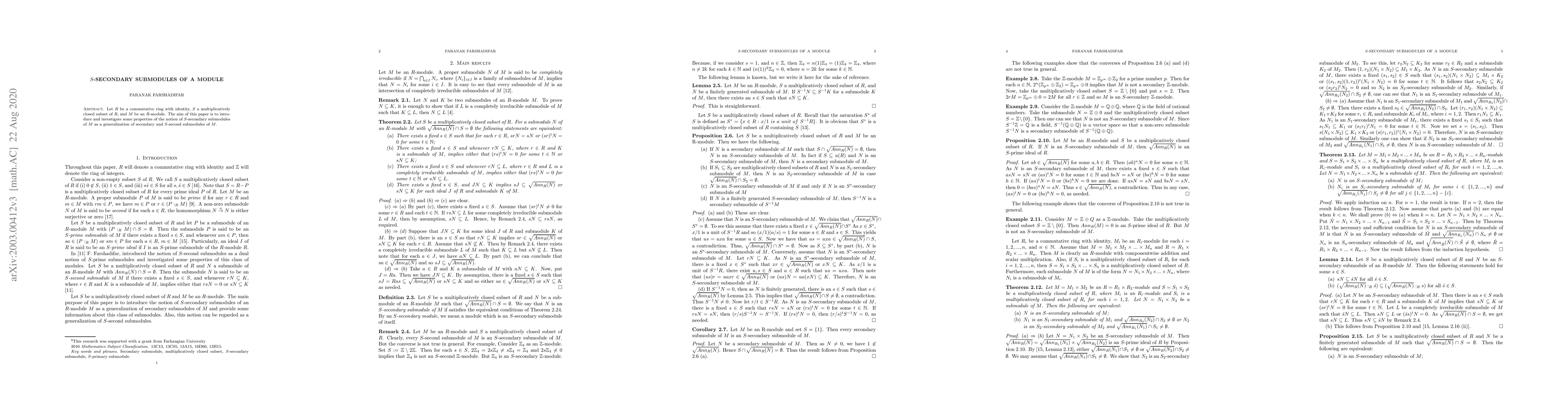 This paper introduces the concept of $S$-secondary submodules in the context of $R$-modules, generalizing the notion of secondary submodules, and explores various properties of this new class of submodules.