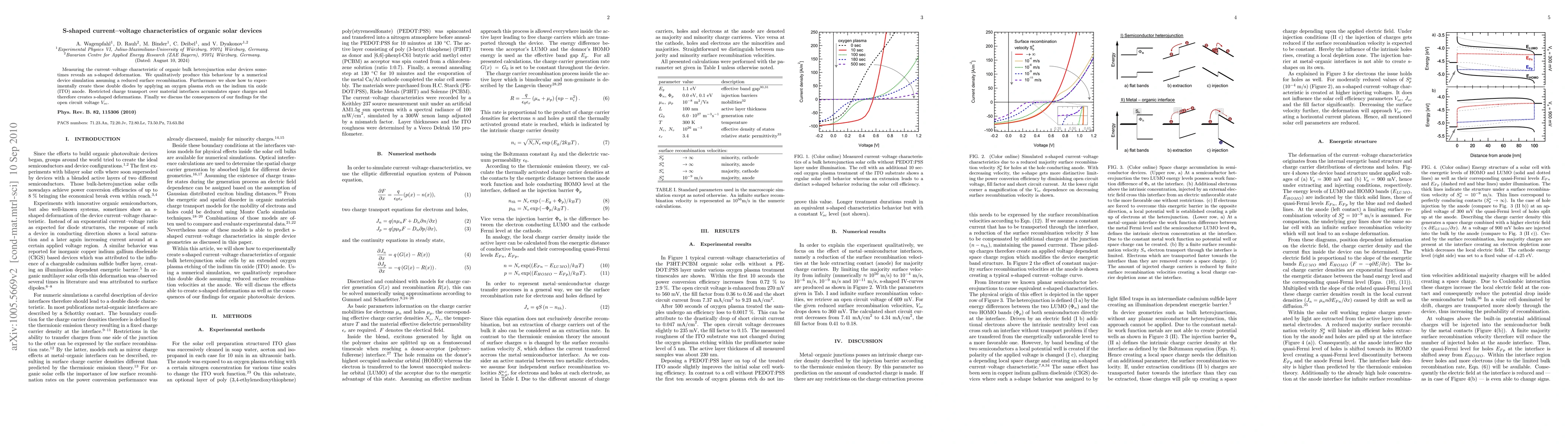 This paper investigates the s-shaped current-voltage characteristics in organic solar devices, attributing the phenomenon to restricted charge transport and surface recombination. Experimentally, it demonstrates the creation of such double diodes via an oxygen plasma etch on the ITO anode, with implications for the open circuit voltage.