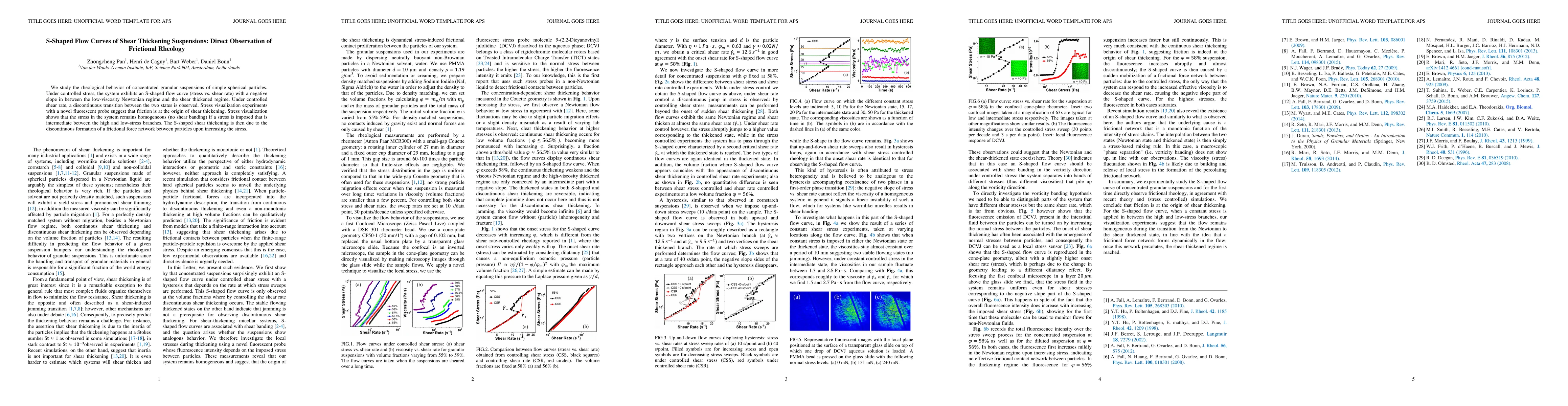 This study investigates the rheological behavior of concentrated granular suspensions, revealing an S-shaped flow curve with a negative slope between Newtonian and shear thickening regimes. Stress visualization indicates that frictional interactions drive the discontinuous transition and formation of a frictional force network in the shear thickening process.