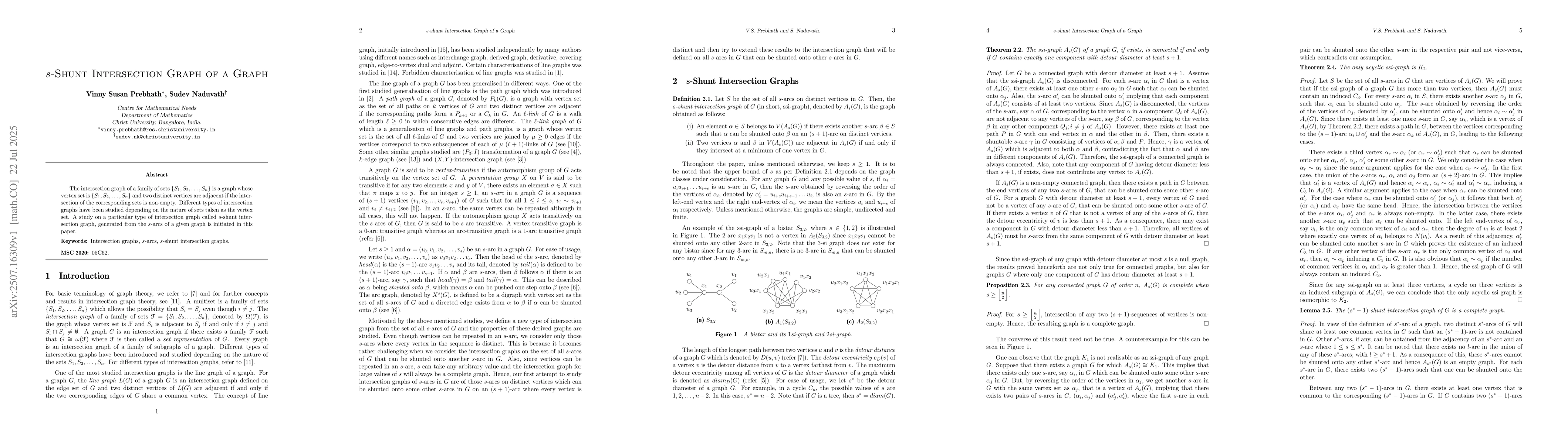 The intersection graph of a family of sets $\{S_{1},S_{2},\ldots,S_{n}\}$ is a graph whose vertex set is $\{S_{1},S_{2},\ldots,S_{n}\}$ and two distinct vertices are adjacent if the intersection of the corresponding sets is non-empty. Different types of intersection graphs have been studied depending on the nature of sets taken as the vertex set. A study on a particular type of intersection graph called $s$-shunt intersection graph, generated from the $s$-arcs of a given graph is initiated in this paper.