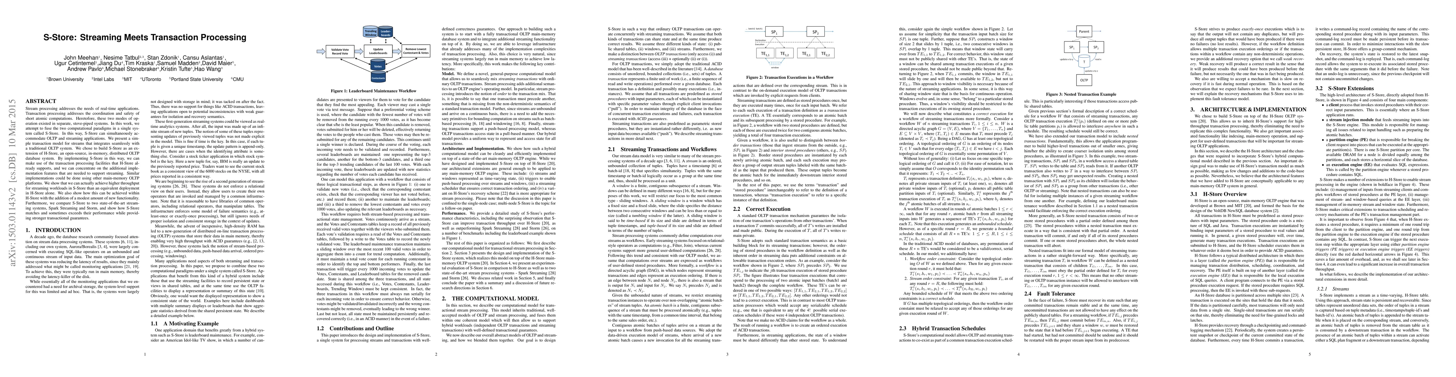 S-Store integrates streaming and transaction processing in a single system, extending H-Store to support both OLTP and streaming workloads, achieving higher throughput and better performance than standalone streaming systems while maintaining strong transactional guarantees.