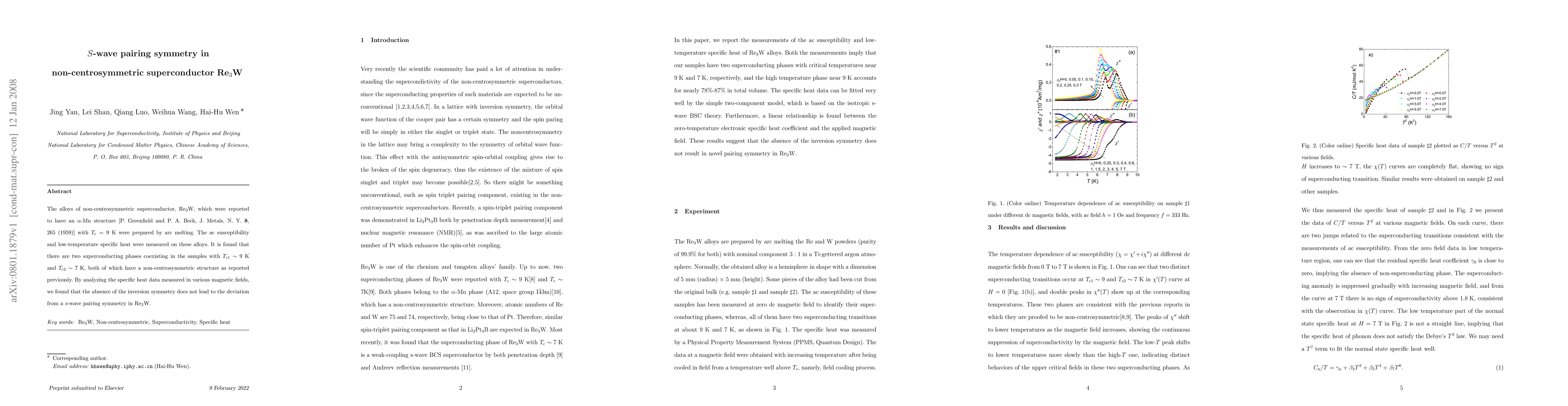 The alloys of non-centrosymmetric superconductor, Re$_3$W, which were reported to have an $\alpha$-Mn structure [P. Greenfield and P. A. Beck, J. Metals, N. Y. \textbf{8}, 265 (1959)] with $T_\mathrm{c}=9 $K were prepared by arc melting. The ac susceptibility and low-temperature specific heat were measured on these alloys. It is found that there are two superconducting phases coexisting in the samples with $T_\mathrm{c1}\sim9 $K and $T_\mathrm{c2}\sim7 $K, both of which have a non-centrosymmetric structure as reported previously. By analyzing the specific heat data measured in various magnetic fields, we found that the absence of the inversion symmetry does not lead to the deviation from a s-wave pairing symmetry in Re$_3$W.