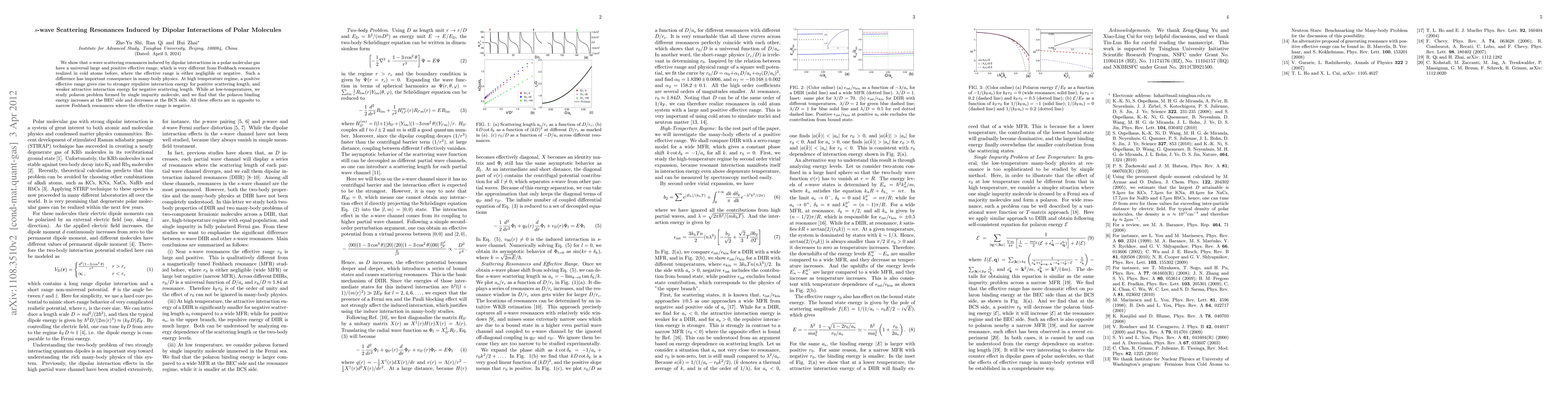 We show that s-wave scattering resonances induced by dipolar interactions in a polar molecular gas have a universal large and positive effective range, which is very different from Feshbach resonances realized in cold atoms before, where the effective range is either negligible or negative. Such a difference has important consequence in many-body physics. At high temperature regime, a positive effective range gives rise to stronger repulsive interaction energy for positive scattering length, and weaker attractive interaction energy for negative scattering length. While at low-temperatures, we study polaron problem formed by single impurity molecule, and we find that the polaron binding energy increases at the BEC side and decreases at the BCS side. All these effects are in opposite to narrow Feshbach resonances where the effective range is negative.