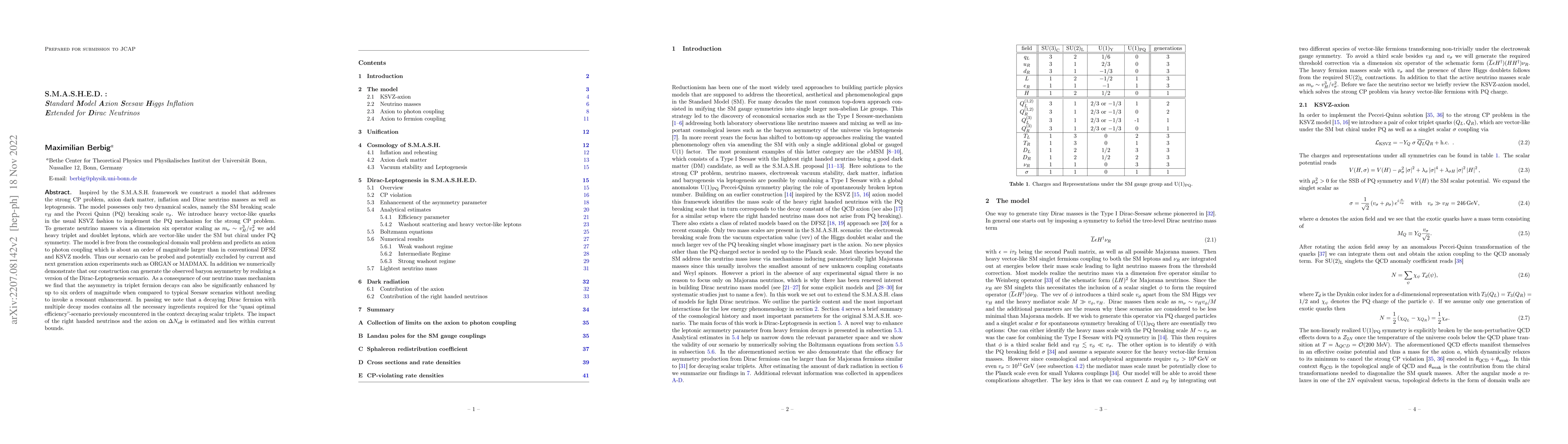 This paper extends the S.M.A.S.H. framework to incorporate Dirac neutrinos, addressing the strong CP problem, axion dark matter, inflation, and leptogenesis. The model introduces heavy vector-like quarks and leptons to generate neutrino masses and predict a larger axion-photon coupling, enhancing the potential for experimental detection. It also demonstrates the generation of observed baryon asymmetry via Dirac-Leptogenesis.