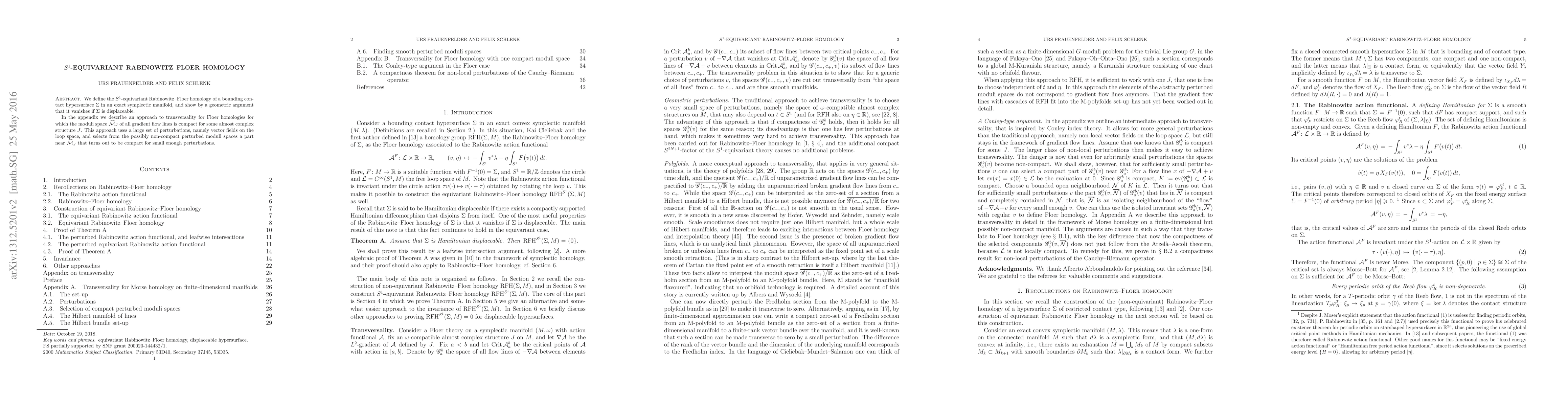 We define the $S^1$-equivariant Rabinowitz-Floer homology of a bounding contact hypersurface $\Sigma$ in an exact symplectic manifold, and show by a geometric argument that it vanishes if $\Sigma$ is displaceable. In the appendix we describe an approach to transversality for Floer homologies for which the moduli space $\widehat M_J$ of all gradient flow lines is compact for some almost complex structure $J$. This approach uses a large set of perturbations, namely vector fields on the loop space, and selects from the possibly non-compact perturbed moduli spaces a part near $\widehat M_J$ that turns out to be compact for small enough perturbations.