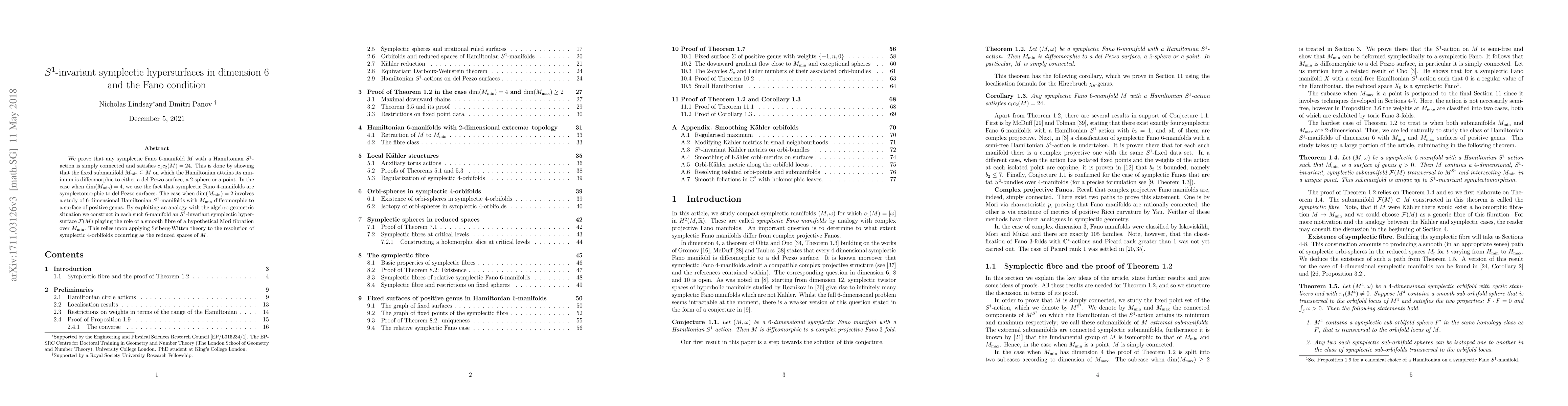 We prove that any symplectic Fano $6$-manifold $M$ with a Hamiltonian $S^1$-action is simply connected and satisfies $c_1 c_2(M)=24$. This is done by showing that the fixed submanifold $M_{\min}\subseteq M$ on which the Hamiltonian attains its minimum is diffeomorphic to either a del Pezzo surface, a $2$-sphere or a point. In the case when $\dim(M_{\min})=4$, we use the fact that symplectic Fano $4$-manifolds are symplectomorphic to del Pezzo surfaces. The case when $\dim(M_{\min})=2$ involves a study of $6$-dimensional Hamiltonian $S^1$-manifolds with $M_{\min}$ diffeomorphic to a surface of positive genus. By exploiting an analogy with the algebro-geometric situation we construct in each such $6$-manifold an $S^1$-invariant symplectic hypersurface ${\cal F}(M)$ playing the role of a smooth fibre of a hypothetical Mori fibration over $M_{\min}$. This relies upon applying Seiberg-Witten theory to the resolution of symplectic $4$-orbifolds occurring as the reduced spaces of $M$.