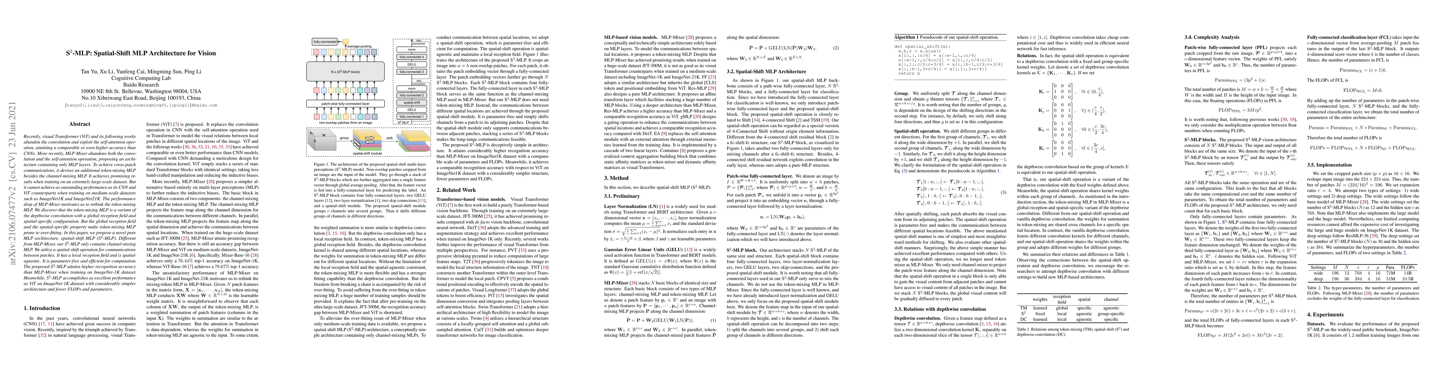 This paper proposes a novel spatial-shift MLP (S$^2$-MLP) architecture that achieves higher recognition accuracy than MLP-Mixer on medium-scale datasets like ImageNet-1K. Unlike MLP-Mixer, S$^2$-MLP uses a spatial-shift operation for local patch communication, avoiding the over-fitting issues of global reception fields in MLP-Mixer.