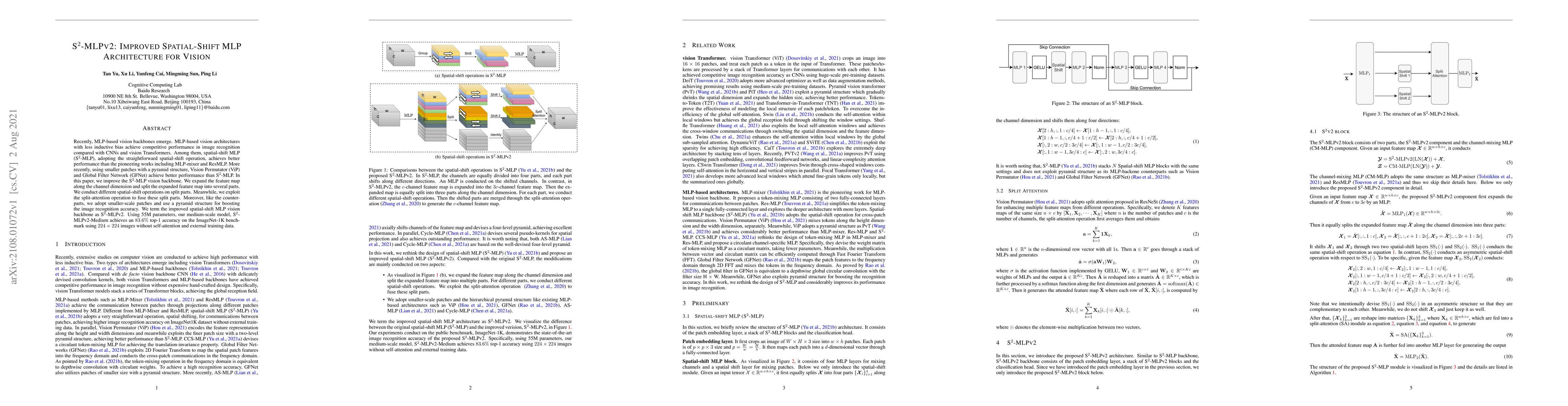 Recently, MLP-based vision backbones emerge. MLP-based vision architectures with less inductive bias achieve competitive performance in image recognition compared with CNNs and vision Transformers. Among them, spatial-shift MLP (S$^2$-MLP), adopting the straightforward spatial-shift operation, achieves better performance than the pioneering works including MLP-mixer and ResMLP. More recently, using smaller patches with a pyramid structure, Vision Permutator (ViP) and Global Filter Network (GFNet) achieve better performance than S$^2$-MLP. In this paper, we improve the S$^2$-MLP vision backbone. We expand the feature map along the channel dimension and split the expanded feature map into several parts. We conduct different spatial-shift operations on split parts. Meanwhile, we exploit the split-attention operation to fuse these split parts. Moreover, like the counterparts, we adopt smaller-scale patches and use a pyramid structure for boosting the image recognition accuracy. We term the improved spatial-shift MLP vision backbone as S$^2$-MLPv2. Using 55M parameters, our medium-scale model, S$^2$-MLPv2-Medium achieves an $83.6\%$ top-1 accuracy on the ImageNet-1K benchmark using $224\times 224$ images without self-attention and external training data.