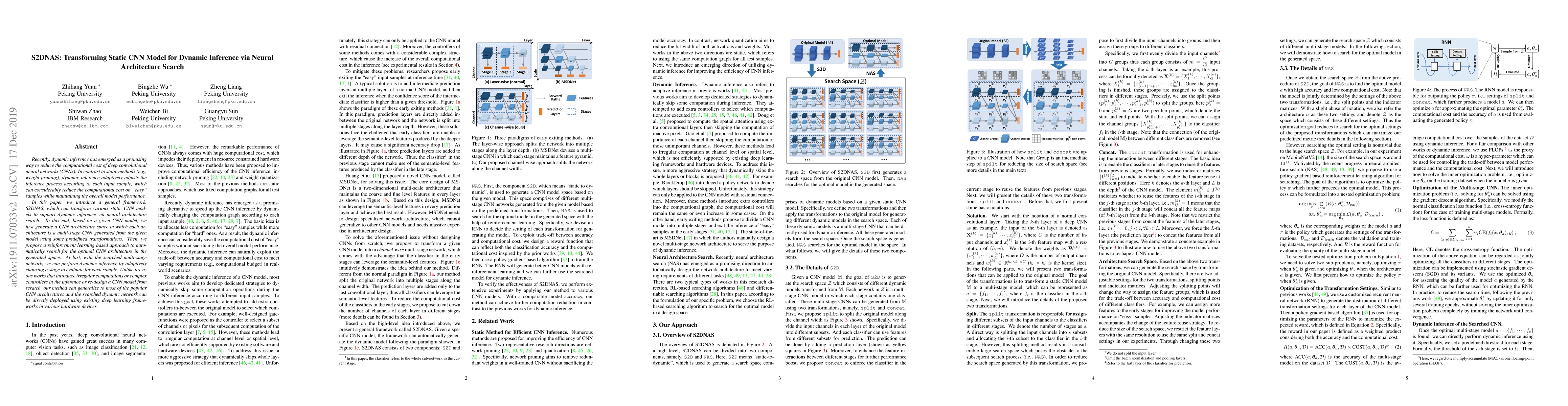 This paper introduces S2DNAS, a framework for transforming static CNN models to support dynamic inference through neural architecture search. It generates multi-stage CNN architectures from a given model and employs reinforcement learning to find the optimal architecture, enabling adaptive inference that reduces computational costs for easy samples while maintaining performance.