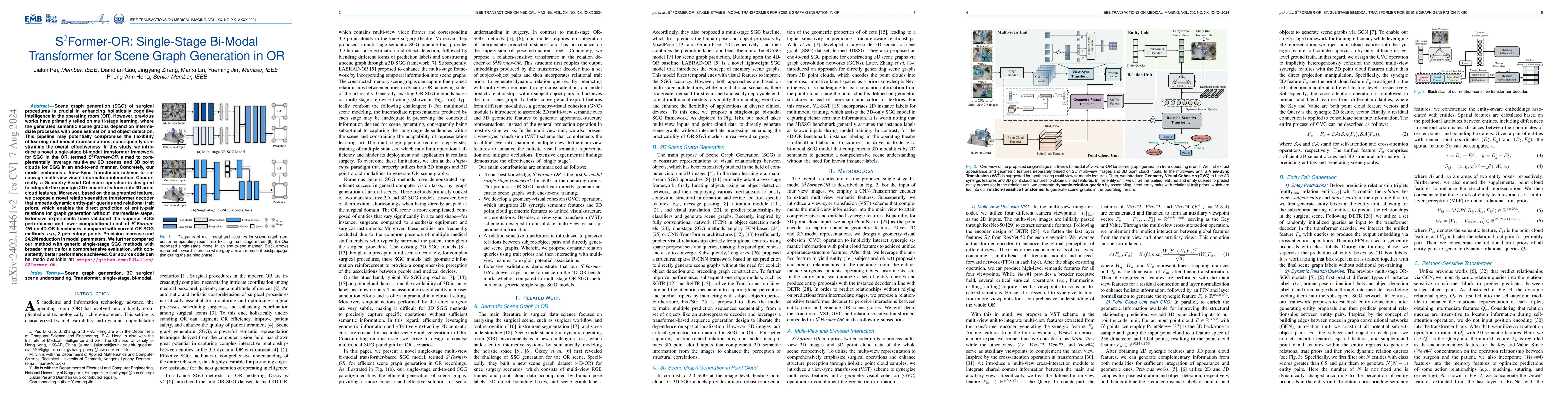 The paper introduces S^2Former-OR, a single-stage bimodal transformer framework for scene graph generation in operating rooms, leveraging multi-view 2D scenes and 3D point clouds to enhance efficiency and reduce annotation burden. The model achieves superior performance and lower computational cost compared to existing methods, demonstrating a 3% precision increase and significant reduction in model parameters.