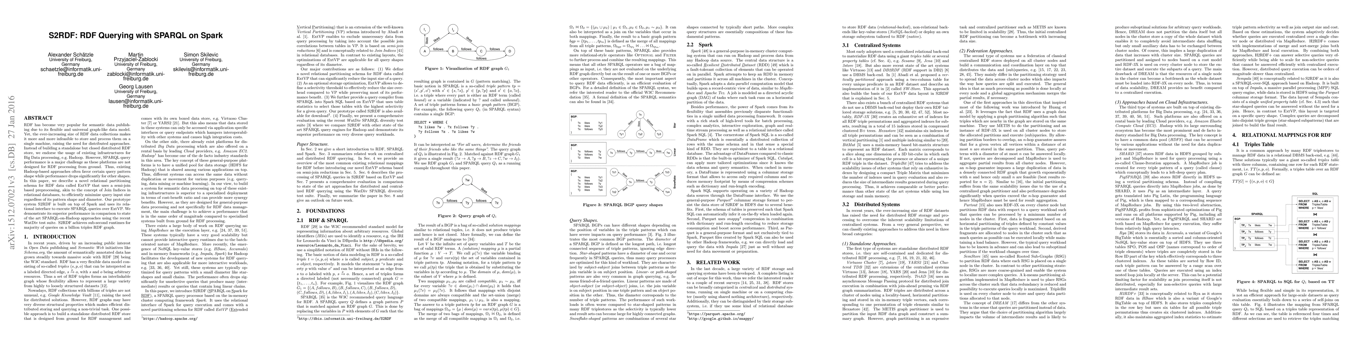 S2RDF utilizes Spark for efficient distributed SPARQL querying over RDF data through a relational partitioning schema called ExtVP, achieving better performance compared to existing Hadoop-based solutions, especially for diverse query patterns. The system demonstrates sub-second query times on large-scale RDF datasets.