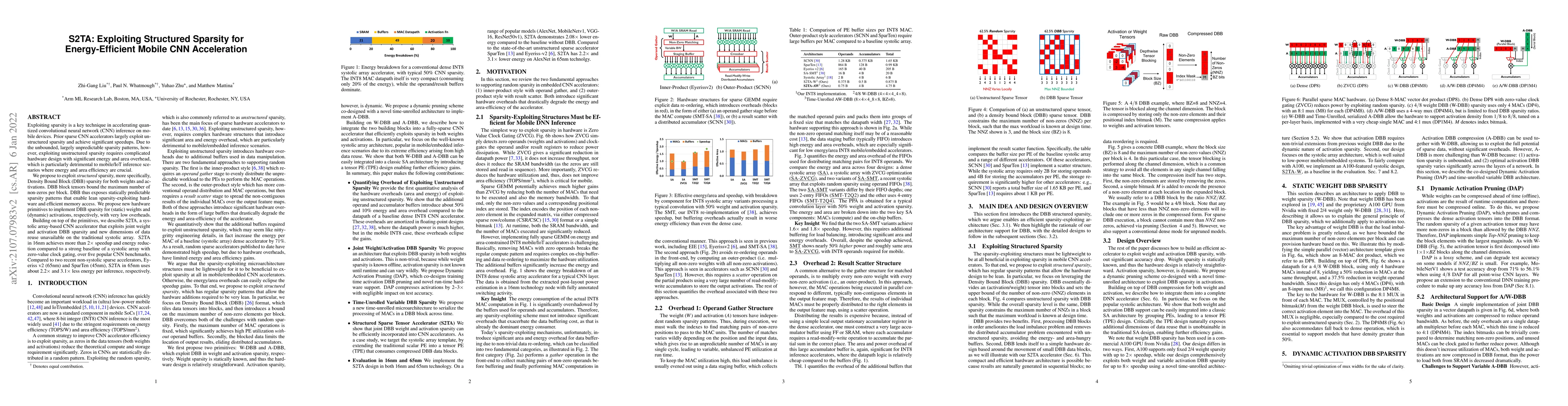 The paper proposes S2TA, a systolic array-based CNN accelerator that exploits structured sparsity through Density Bound Block (DBB) patterns for both weights and activations, achieving significant energy and speed improvements over traditional systolic arrays and other sparse accelerators. S2TA demonstrates more than 2x speedup and energy reduction across multiple benchmarks.