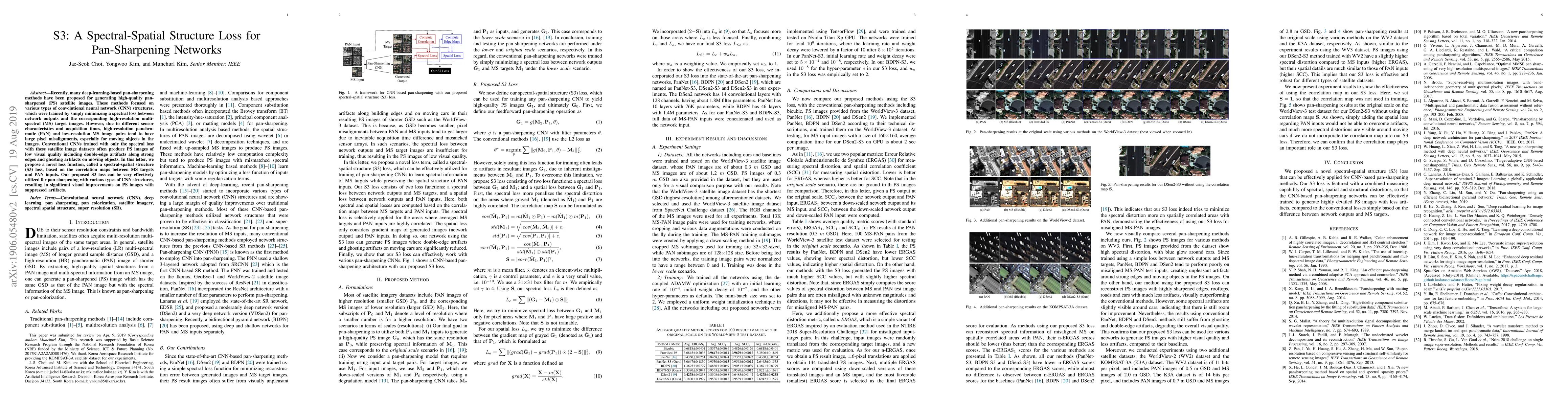 This paper proposes a novel spectral-spatial structure (S3) loss for pan-sharpening networks to improve the visual quality of high-resolution satellite images. The S3 loss addresses misalignments and artifacts in conventional CNN-based methods, leading to better-aligned and artifact-free pan-sharpened images.