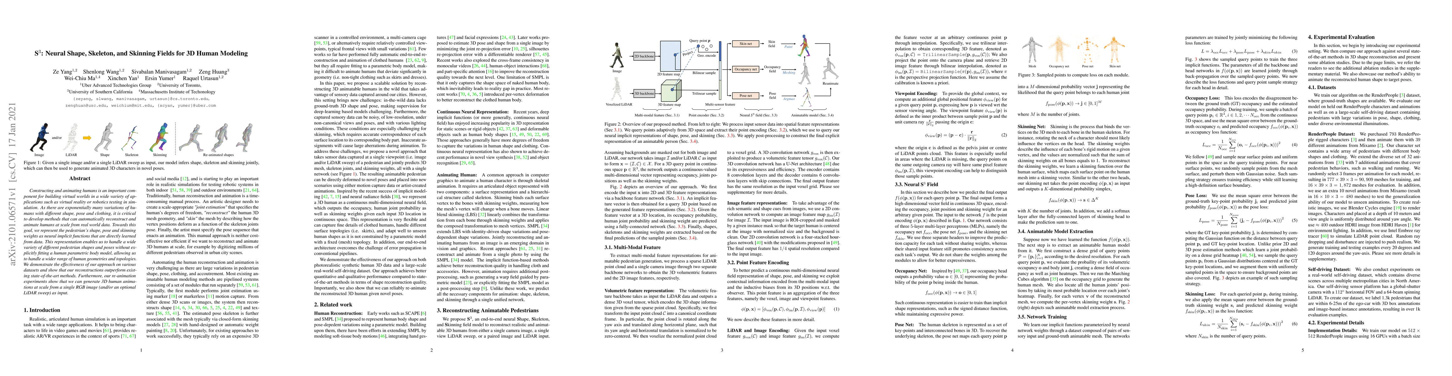 Constructing and animating humans is an important component for building virtual worlds in a wide variety of applications such as virtual reality or robotics testing in simulation. As there are exponentially many variations of humans with different shape, pose and clothing, it is critical to develop methods that can automatically reconstruct and animate humans at scale from real world data. Towards this goal, we represent the pedestrian's shape, pose and skinning weights as neural implicit functions that are directly learned from data. This representation enables us to handle a wide variety of different pedestrian shapes and poses without explicitly fitting a human parametric body model, allowing us to handle a wider range of human geometries and topologies. We demonstrate the effectiveness of our approach on various datasets and show that our reconstructions outperform existing state-of-the-art methods. Furthermore, our re-animation experiments show that we can generate 3D human animations at scale from a single RGB image (and/or an optional LiDAR sweep) as input.