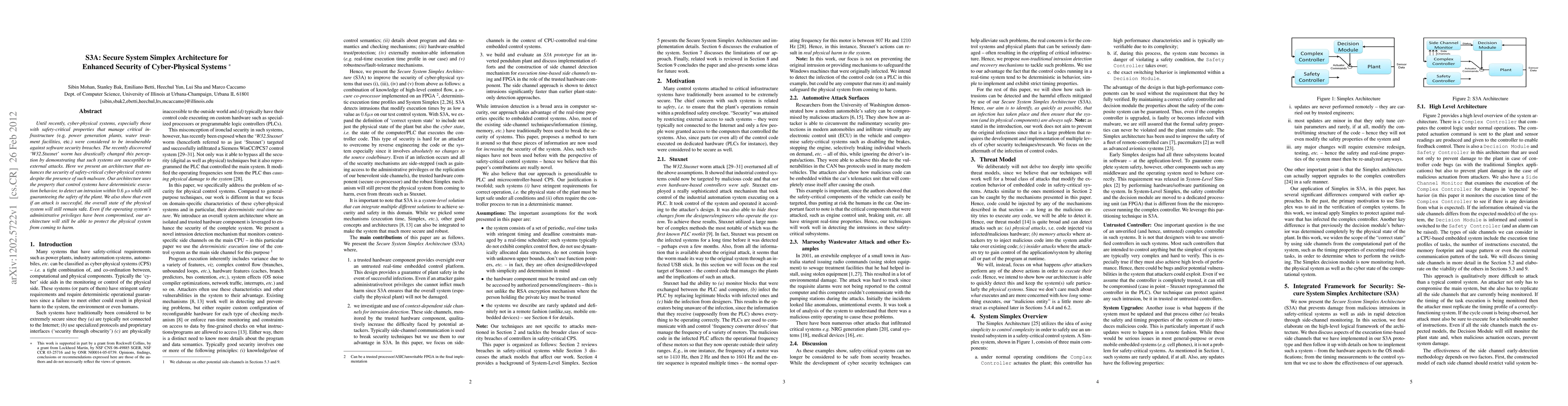 This paper introduces S3A, a Secure System Simplex Architecture designed to enhance the security of safety-critical cyber-physical systems against software breaches, leveraging the deterministic nature of control systems to detect intrusions within 0.6 μs and ensure the physical system remains safe even if an attack compromises administrative privileges.
