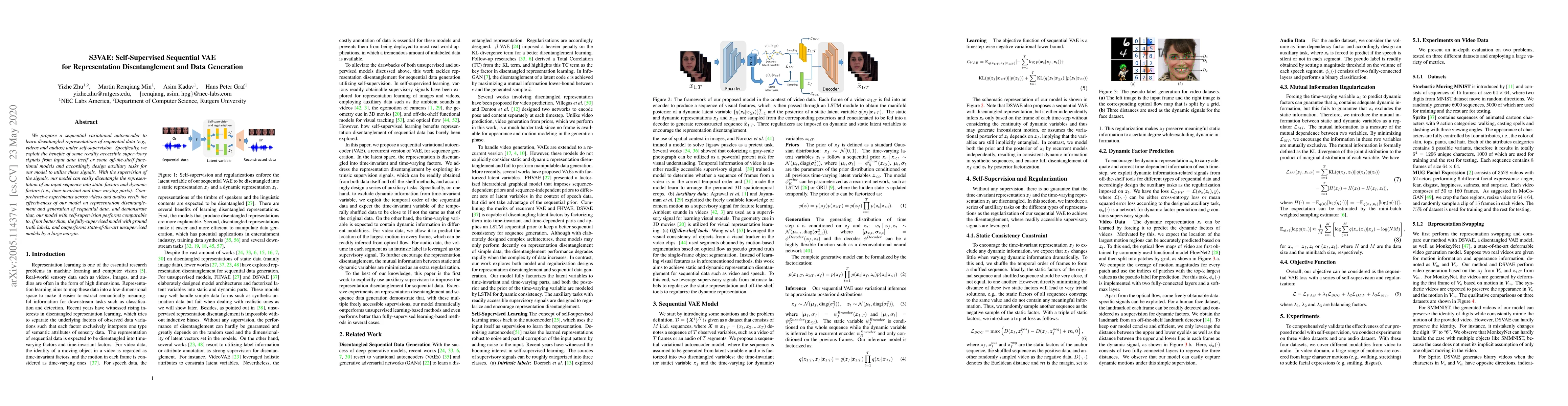 The paper introduces S3VAE, a self-supervised sequential variational autoencoder designed to disentangle representations of sequential data like videos and audios. It leverages self-generated supervisory signals for auxiliary tasks, achieving comparable or superior performance to fully-supervised models and significantly outperforming state-of-the-art unsupervised models in representation disentanglement and data generation.