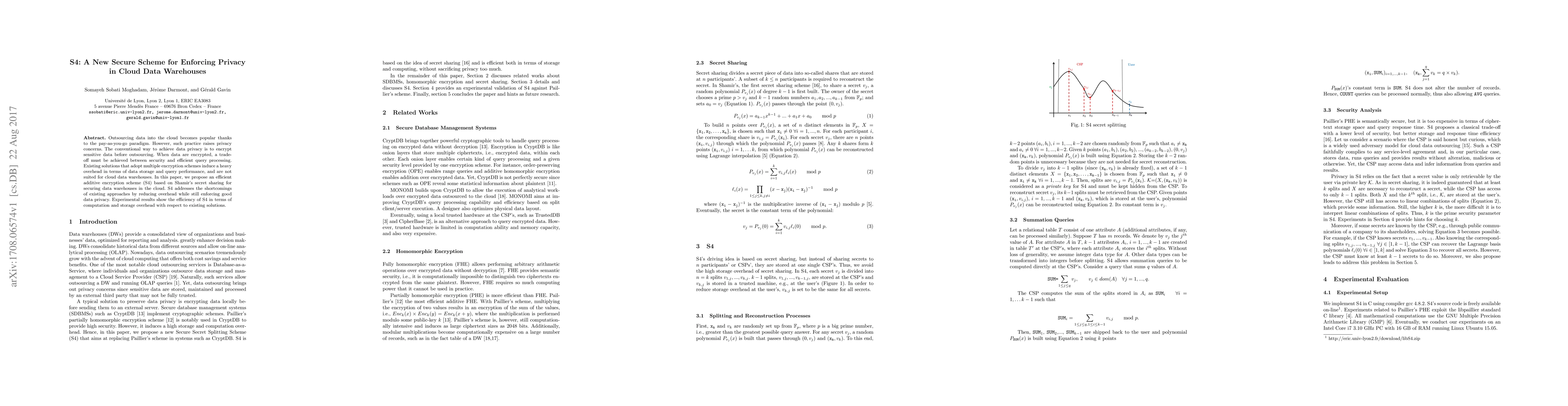 This paper proposes S4, an efficient additive encryption scheme based on Shamir's secret sharing to secure cloud data warehouses, addressing the trade-off between privacy and query efficiency. Experimental results demonstrate S4's reduced computation and storage overhead compared to existing multi-encryption solutions.