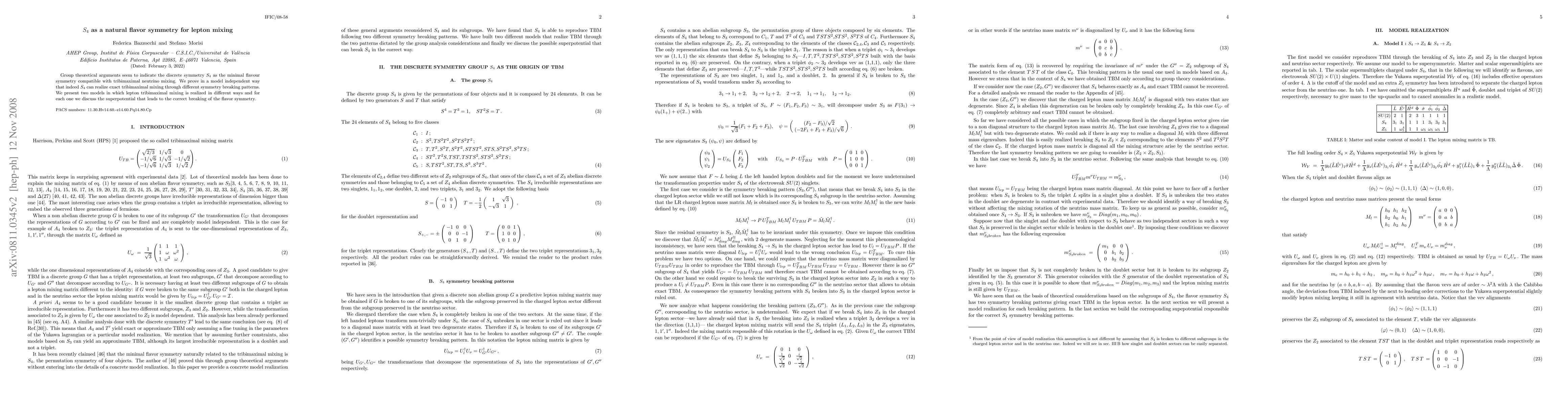 Group theoretical arguments seem to indicate the discrete symmetry S4 as the minimal flavour symmetry compatible with tribimaximal neutrino mixing. We prove in a model independent way that indeed S4 can realize exact tribimaximal mixing through different symmetry breaking patterns. We present two models in which lepton tribimaximal mixing is realized in different ways and for each one we discuss the superpotential that leads to the correct breaking of the flavor symmetry.