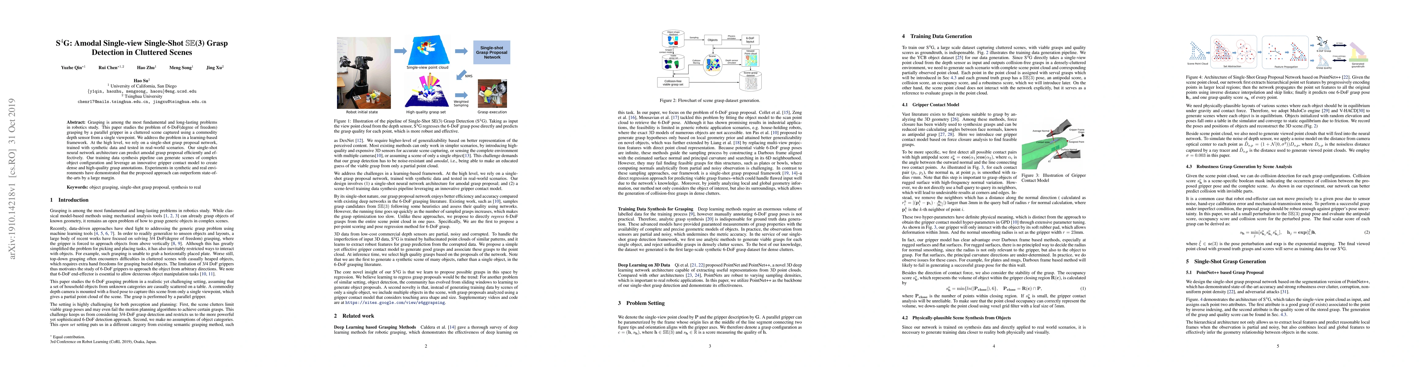 Grasping is among the most fundamental and long-lasting problems in robotics study. This paper studies the problem of 6-DoF(degree of freedom) grasping by a parallel gripper in a cluttered scene captured using a commodity depth sensor from a single viewpoint. We address the problem in a learning-based framework. At the high level, we rely on a single-shot grasp proposal network, trained with synthetic data and tested in real-world scenarios. Our single-shot neural network architecture can predict amodal grasp proposal efficiently and effectively. Our training data synthesis pipeline can generate scenes of complex object configuration and leverage an innovative gripper contact model to create dense and high-quality grasp annotations. Experiments in synthetic and real environments have demonstrated that the proposed approach can outperform state-of-the-arts by a large margin.