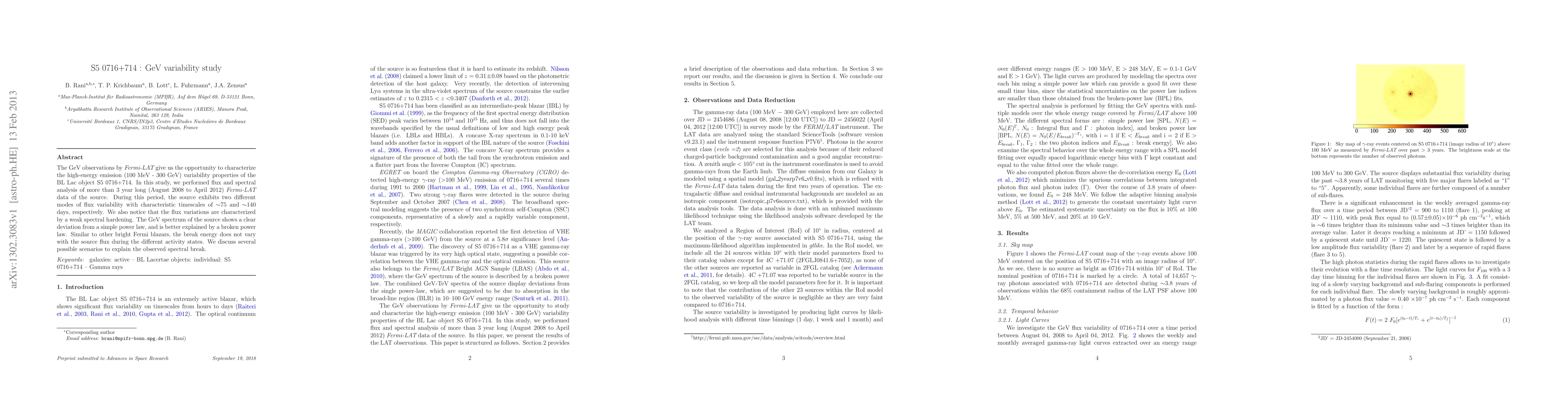 The GeV observations by Fermi-LAT give us the opportunity to characterize the high-energy emission (100 MeV - 300 GeV) variability properties of the BL Lac object S5 0716+714. In this study, we performed flux and spectral analysis of more than 3 year long (August 2008 to April 2012) Fermi-LAT data of the source. During this period, the source exhibits two different modes of flux variability with characteristic timescales of ~75 and ~140 days, respectively. We also notice that the flux variations are characterized by a weak spectral hardening. The GeV spectrum of the source shows a clear deviation from a simple power law, and is better explained by a broken power law. Similar to other bright Fermi blazars, the break energy does not vary with the source flux during the different activity states. We discuss several possible scenarios to explain the observed spectral break.