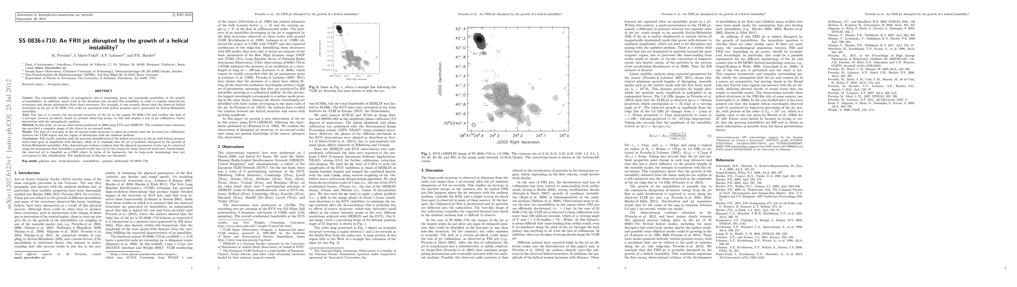 The remarkable stability of extragalactic jets is surprising, given the reasonable possibility of the growth of instabilities. In addition, much work in the literature has invoked this possibility in order to explain observed jet structures and obtain information from these structures. For example, it was recently shown that the observed helical structures in the jet in S5 0836+710 could be associated with helical pressure waves generated by Kelvin-Helmholtz instability. Our aim is to resolve the arc-second structure of the jet in the quasar S5 0836+710 and confirm the lack of a hot-spot (reverse jet-shock) found by present observing arrays, as this lack implies a loss of jet collimation before interaction with the intergalactic medium. In this work, we use an observation performed in 2008 using EVN and MERLIN. The combined data reduction has provided a complete image of the object at arc-second scales. The lack of a hot-spot in the arc-second radio structure is taken as evidence that the jet losses its collimation between the VLBI region and the region of interaction with the ambient medium. This result, together with the previous identification of the helical structures in the jet with helical pressure waves that grow in amplitude with distance, allow us to conclude that the jet is probably disrupted by the growth of Kelvin-Helmholtz instability. This observational evidence confirms that the physical parameters of jets can be extracted using the assumption that instability is present in jets and can be the reason for many observed structures. Interestingly, the observed jet is classified as a FRII object in terms of its luminosity, but its large-scale morphology does not correspond to this classification. The implications of this fact are discussed.