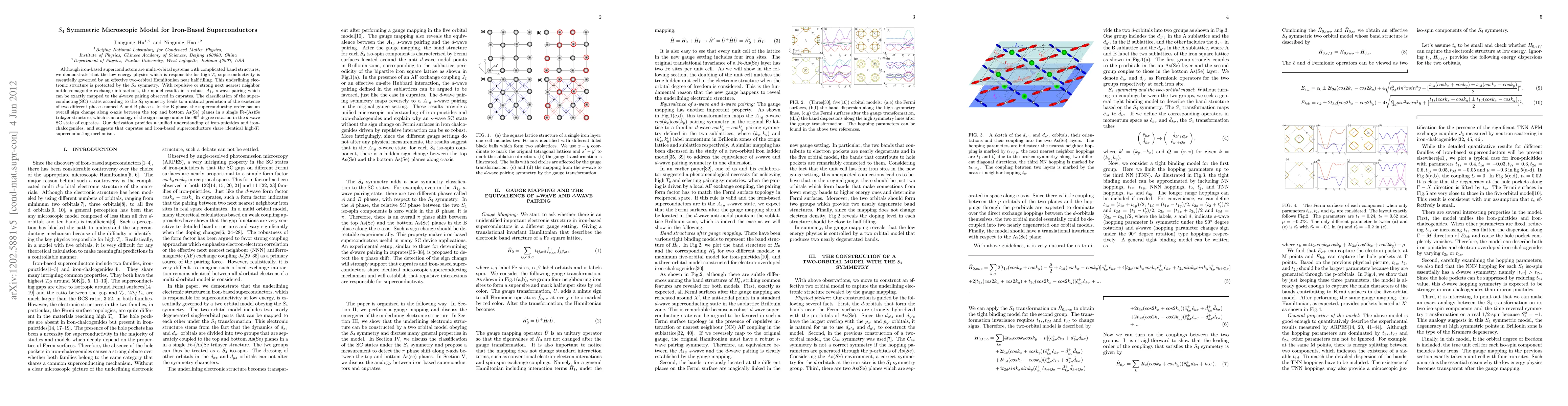 This paper proposes an $S_4$ symmetric microscopic model explaining the high-$T_c$ superconductivity in iron-based superconductors via an effective Hamiltonian with two decoupled orbitals. It predicts two distinct superconducting phases (A and B) and shows that the s-wave pairing mechanism in iron superconductors parallels the d-wave pairing in cuprates.