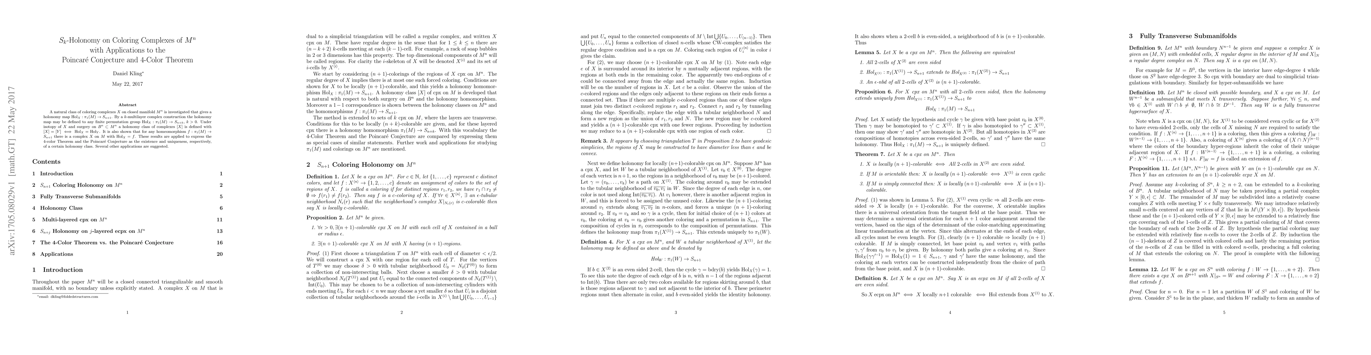 A natural class of coloring complexes $X$ on closed manifold $M^n$ is investigated that gives a holonomy map $\mbox{Hol}_X: \pi_1(M) \to S_{n+1}$. By a $k$-multilayer complex construction the holonomy map may be defined to any finite permutation group $\mbox{Hol}_X: \pi_1(M) \to S_{n+k}$, $k>0$. Under isotopy of $X$ and surgery on $B^n \subset M^n$ a holonomy class of complexes $[X]$ is defined with $[X]=[Y] \iff \mbox{Hol}_X = \mbox{Hol}_Y$. It is also shown that for any homeomorphism $f:\pi_1(M) \to S_{n+1}$ there is a complex $X$ on $M$ with $\mbox{Hol}_X =f$. These results are applied to express the $4$-color Theorem and the Poincar\'e Conjecture as the existence and uniqueness, respectively, of a certain holonomy class. Several other applications are suggested.