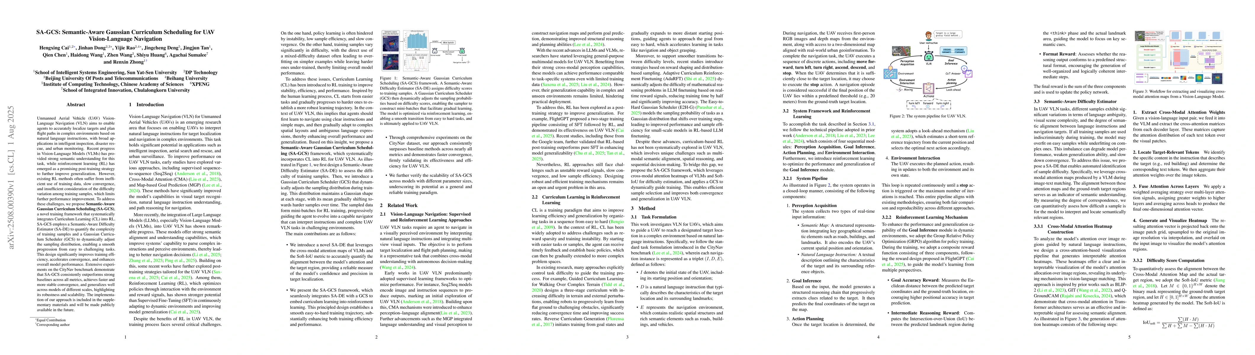 Unmanned Aerial Vehicle (UAV) Vision-Language Navigation (VLN) aims to enable agents to accurately localize targets and plan flight paths in complex environments based on natural language instructions, with broad applications in intelligent inspection, disaster rescue, and urban monitoring. Recent progress in Vision-Language Models (VLMs) has provided strong semantic understanding for this task, while reinforcement learning (RL) has emerged as a promising post-training strategy to further improve generalization. However, existing RL methods often suffer from inefficient use of training data, slow convergence, and insufficient consideration of the difficulty variation among training samples, which limits further performance improvement. To address these challenges, we propose \textbf{Semantic-Aware Gaussian Curriculum Scheduling (SA-GCS)}, a novel training framework that systematically integrates Curriculum Learning (CL) into RL. SA-GCS employs a Semantic-Aware Difficulty Estimator (SA-DE) to quantify the complexity of training samples and a Gaussian Curriculum Scheduler (GCS) to dynamically adjust the sampling distribution, enabling a smooth progression from easy to challenging tasks. This design significantly improves training efficiency, accelerates convergence, and enhances overall model performance. Extensive experiments on the CityNav benchmark demonstrate that SA-GCS consistently outperforms strong baselines across all metrics, achieves faster and more stable convergence, and generalizes well across models of different scales, highlighting its robustness and scalability. The implementation of our approach is publicly available.