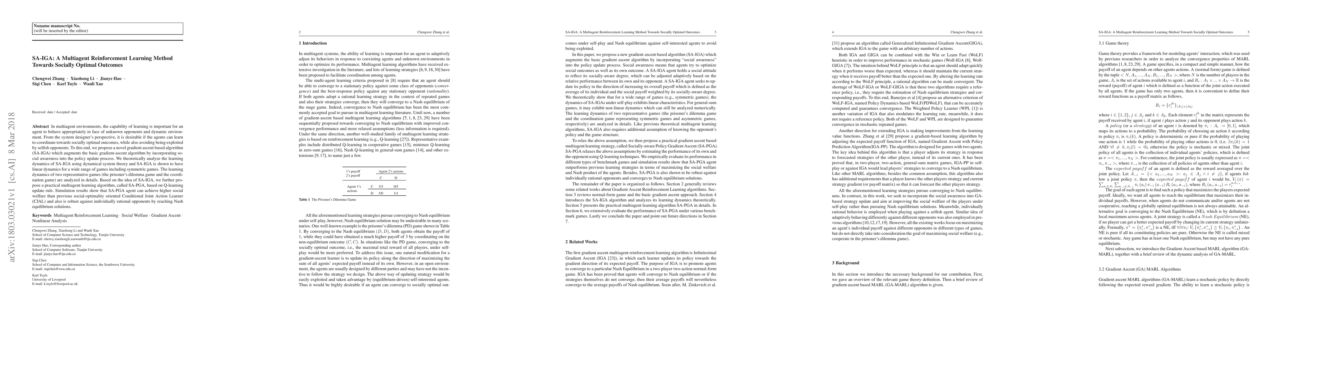 In multiagent environments, the capability of learning is important for an agent to behave appropriately in face of unknown opponents and dynamic environment. From the system designer's perspective, it is desirable if the agents can learn to coordinate towards socially optimal outcomes, while also avoiding being exploited by selfish opponents. To this end, we propose a novel gradient ascent based algorithm (SA-IGA) which augments the basic gradient-ascent algorithm by incorporating social awareness into the policy update process. We theoretically analyze the learning dynamics of SA-IGA using dynamical system theory and SA-IGA is shown to have linear dynamics for a wide range of games including symmetric games. The learning dynamics of two representative games (the prisoner's dilemma game and the coordination game) are analyzed in details. Based on the idea of SA-IGA, we further propose a practical multiagent learning algorithm, called SA-PGA, based on Q-learning update rule. Simulation results show that SA-PGA agent can achieve higher social welfare than previous social-optimality oriented Conditional Joint Action Learner (CJAL) and also is robust against individually rational opponents by reaching Nash equilibrium solutions.