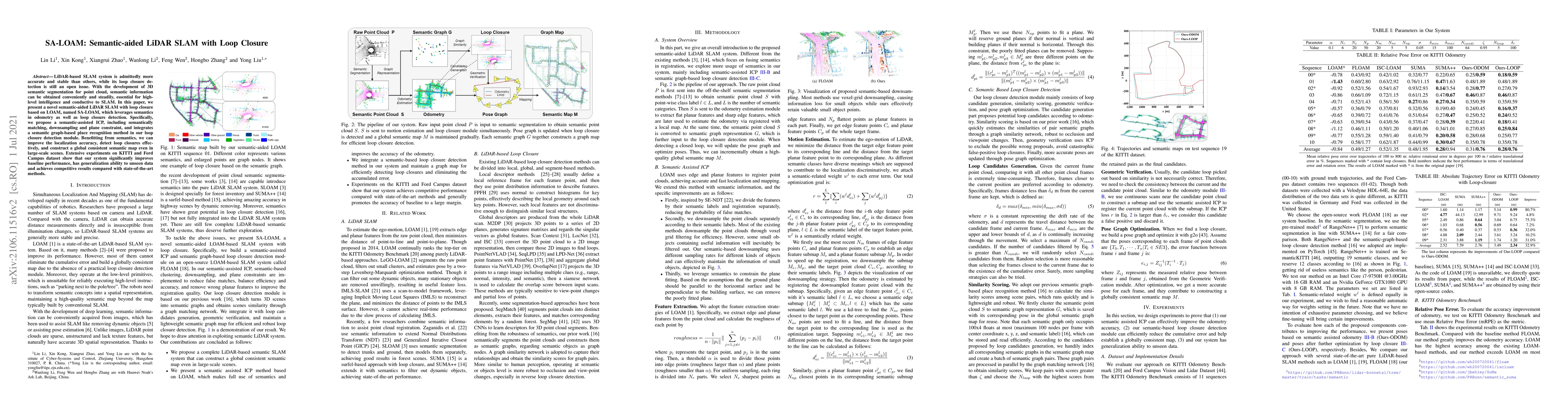 SA-LOAM introduces a semantic-aided LiDAR SLAM system that enhances loop closure detection and localization accuracy by leveraging 3D semantic segmentation. The proposed semantic-assisted ICP and semantic graph-based place recognition significantly improve performance over baseline LOAM, as demonstrated by competitive results on KITTI and Ford Campus datasets.