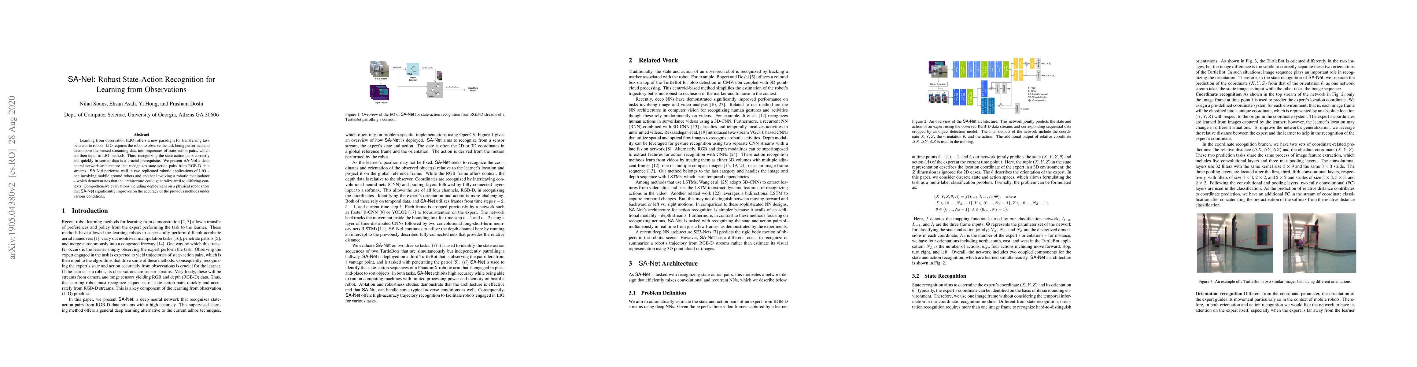 SA-Net is a deep neural network designed to recognize state-action pairs from RGB-D data streams for robot trajectory recognition. It significantly improves the accuracy of previous methods in diverse applications involving mobile ground robots and robotic manipulators.