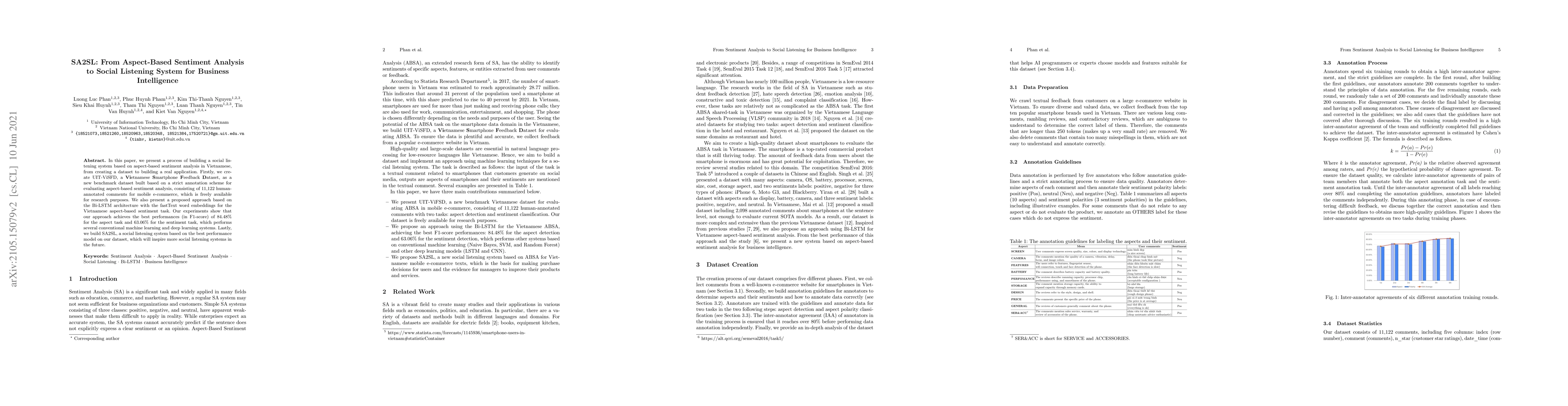 In this paper, we present a process of building a social listening system based on aspect-based sentiment analysis in Vietnamese from creating a dataset to building a real application. Firstly, we create UIT-ViSFD, a Vietnamese Smartphone Feedback Dataset as a new benchmark corpus built based on a strict annotation schemes for evaluating aspect-based sentiment analysis, consisting of 11,122 human-annotated comments for mobile e-commerce, which is freely available for research purposes. We also present a proposed approach based on the Bi-LSTM architecture with the fastText word embeddings for the Vietnamese aspect based sentiment task. Our experiments show that our approach achieves the best performances with the F1-score of 84.48% for the aspect task and 63.06% for the sentiment task, which performs several conventional machine learning and deep learning systems. Last but not least, we build SA2SL, a social listening system based on the best performance model on our dataset, which will inspire more social listening systems in future.