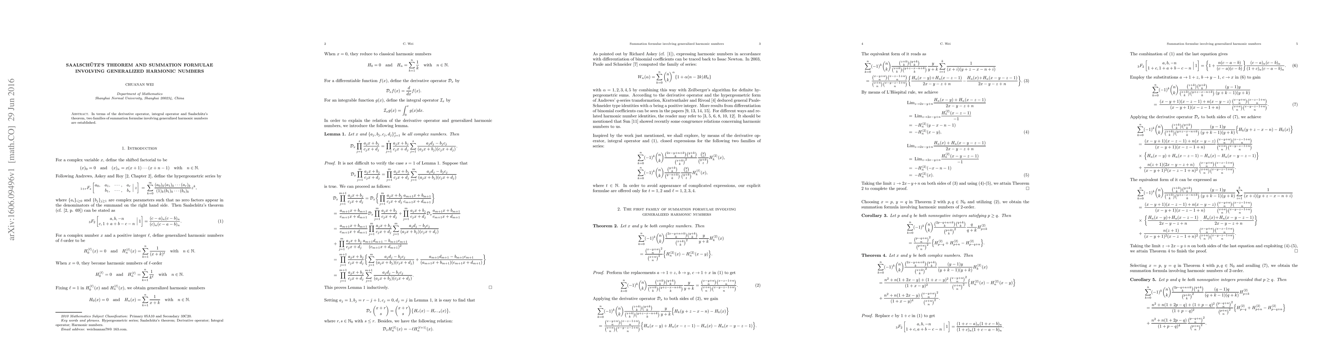 Saalschütz's theorem is utilized to derive two families of summation formulae involving generalized harmonic numbers, employing the derivative and integral operators. These results extend the understanding of harmonic number relationships.