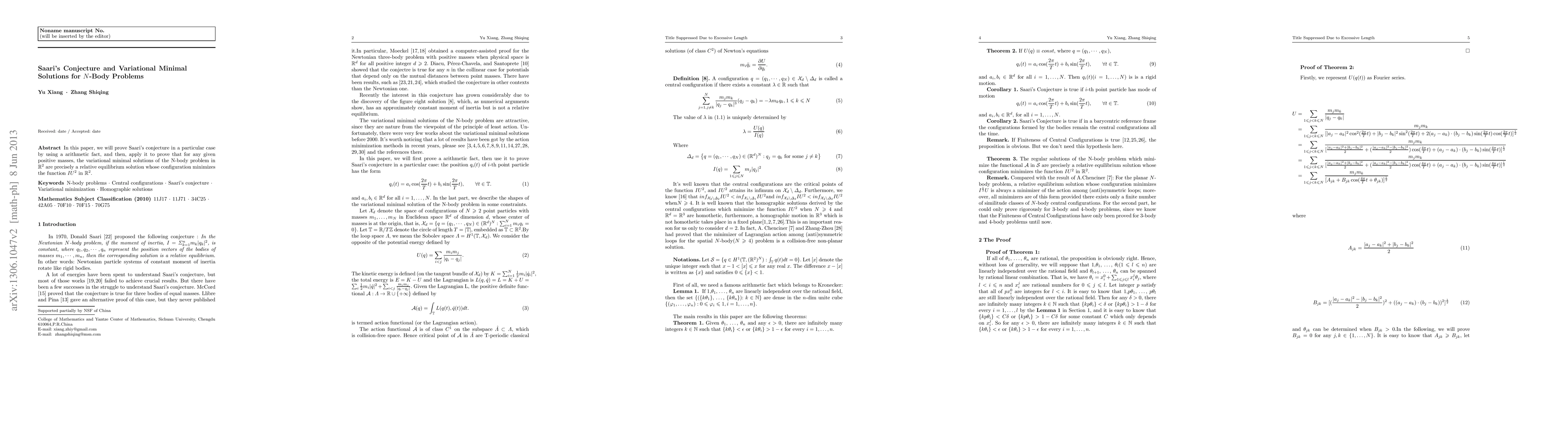 Saari's conjecture is proven in a specific case using an arithmetic fact. The study further demonstrates that for any given positive masses, variational minimal solutions of the N-body problem in ${\mathbb{R}}^2$ correspond to relative equilibrium configurations minimizing the function $IU^2$.