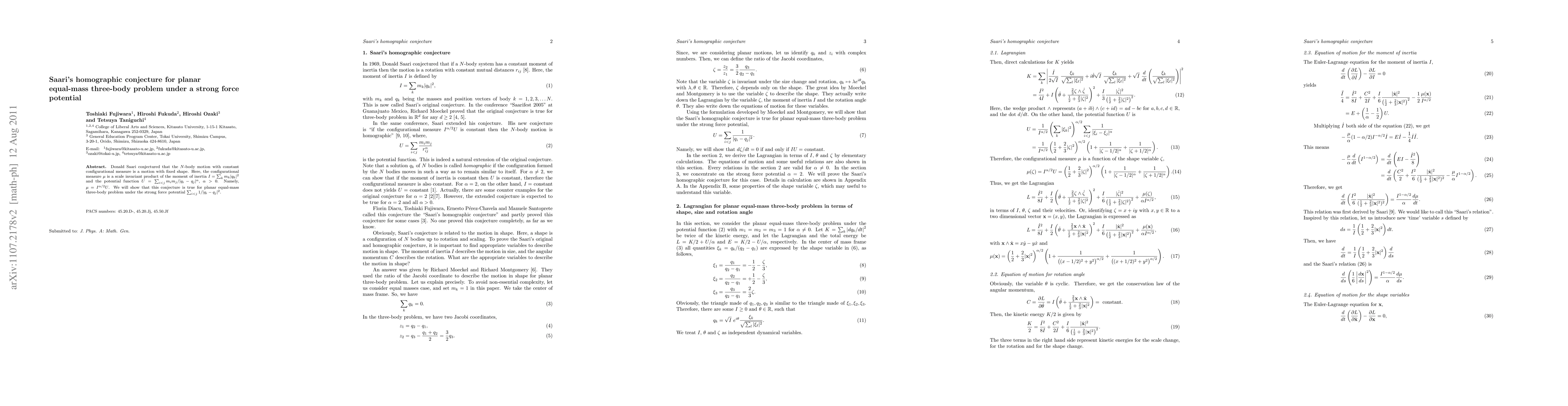 Saari's conjecture posits that $N$-body motion with constant configurational measure is fixed shape motion. This paper proves Saari's conjecture for planar equal-mass three-body systems under the strong force potential, where the configurational measure is a product of moment of inertia and potential function.
