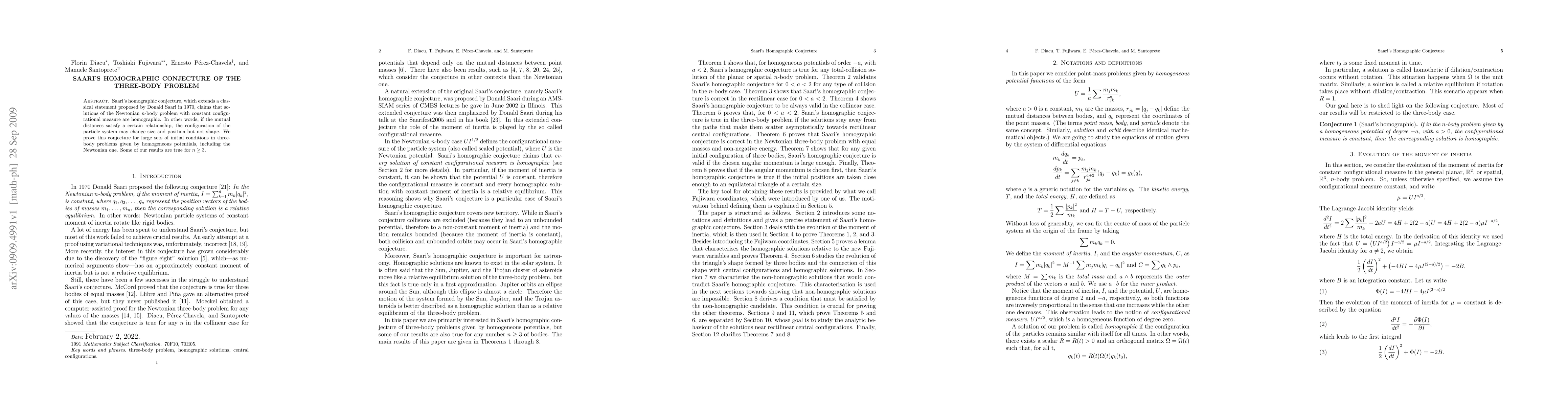Saari's homographic conjecture posits that Newtonian $n$-body solutions with constant configurational measure are homographic. The paper proves this conjecture for three-body problems under homogeneous potentials, including the Newtonian case, for large sets of initial conditions.