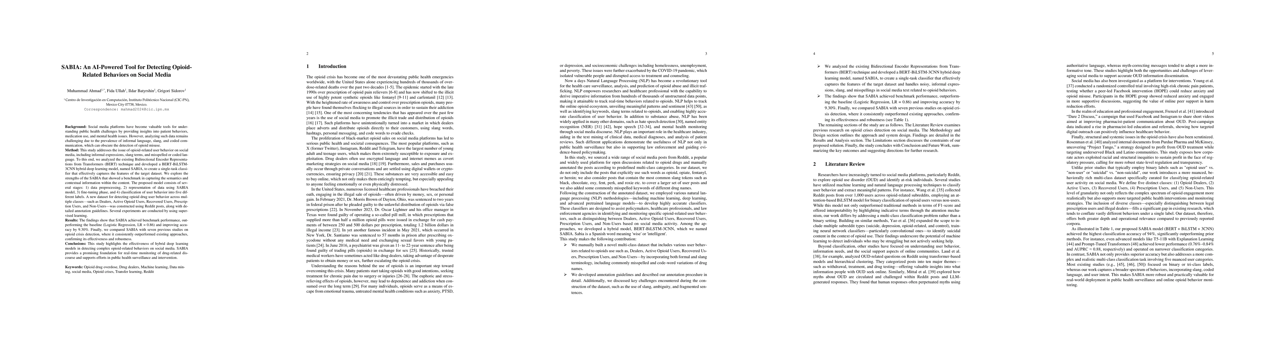 Social media platforms have become valuable tools for understanding public health challenges by offering insights into patient behaviors, medication use, and mental health issues. However, analyzing such data remains difficult due to the prevalence of informal language, slang, and coded communication, which can obscure the detection of opioid misuse. This study addresses the issue of opioid-related user behavior on social media, including informal expressions, slang terms, and misspelled or coded language. We analyzed the existing Bidirectional Encoder Representations from Transformers (BERT) technique and developed a BERT-BiLSTM-3CNN hybrid deep learning model, named SABIA, to create a single-task classifier that effectively captures the features of the target dataset. The SABIA model demonstrated strong capabilities in capturing semantics and contextual information. The proposed approach includes: (1) data preprocessing, (2) data representation using the SABIA model, (3) a fine-tuning phase, and (4) classification of user behavior into five categories. A new dataset was constructed from Reddit posts, identifying opioid user behaviors across five classes: Dealers, Active Opioid Users, Recovered Users, Prescription Users, and Non-Users, supported by detailed annotation guidelines. Experiments were conducted using supervised learning. Results show that SABIA achieved benchmark performance, outperforming the baseline (Logistic Regression, LR = 0.86) and improving accuracy by 9.30%. Comparisons with seven previous studies confirmed its effectiveness and robustness. This study demonstrates the potential of hybrid deep learning models for detecting complex opioid-related behaviors on social media, supporting public health monitoring and intervention efforts.