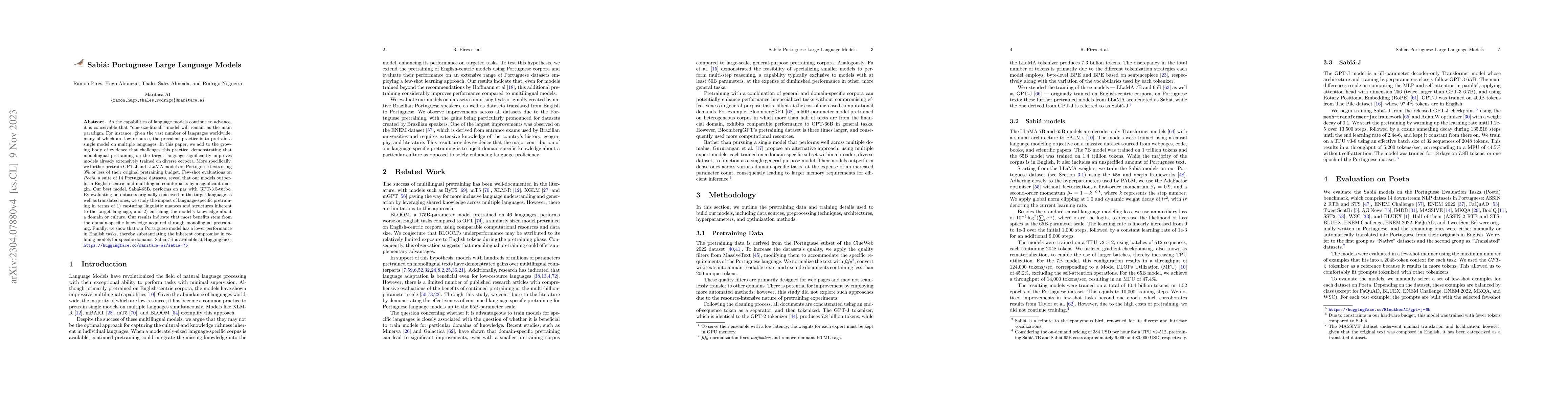 The paper introduces Sabi'a, a Portuguese large language model pre-trained on a small budget, which outperforms existing models on various Portuguese datasets.