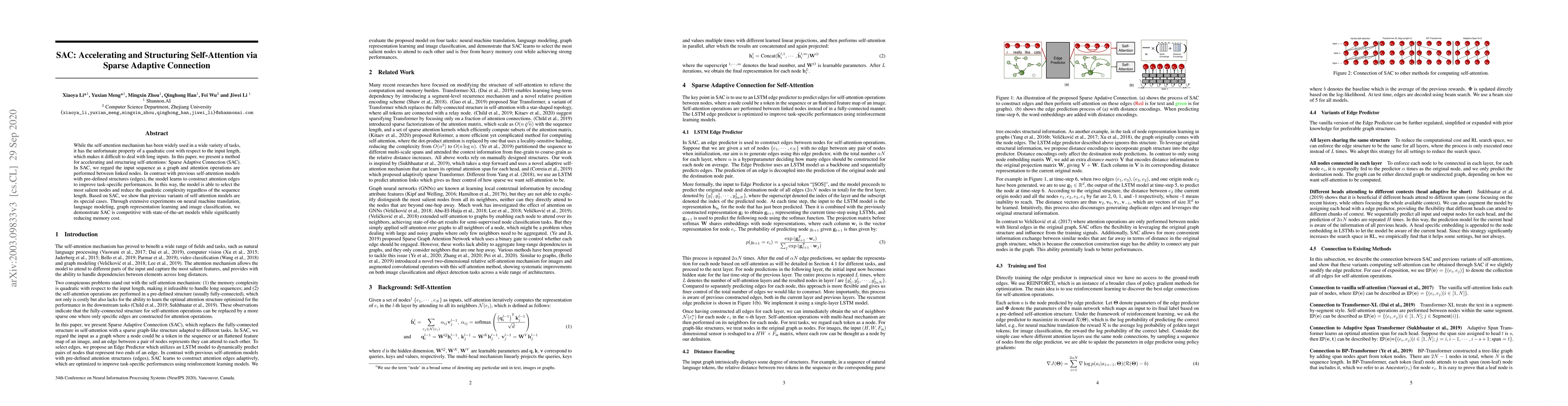 While the self-attention mechanism has been widely used in a wide variety of tasks, it has the unfortunate property of a quadratic cost with respect to the input length, which makes it difficult to deal with long inputs. In this paper, we present a method for accelerating and structuring self-attentions: Sparse Adaptive Connection (SAC). In SAC, we regard the input sequence as a graph and attention operations are performed between linked nodes. In contrast with previous self-attention models with pre-defined structures (edges), the model learns to construct attention edges to improve task-specific performances. In this way, the model is able to select the most salient nodes and reduce the quadratic complexity regardless of the sequence length. Based on SAC, we show that previous variants of self-attention models are its special cases. Through extensive experiments on neural machine translation, language modeling, graph representation learning and image classification, we demonstrate SAC is competitive with state-of-the-art models while significantly reducing memory cost.