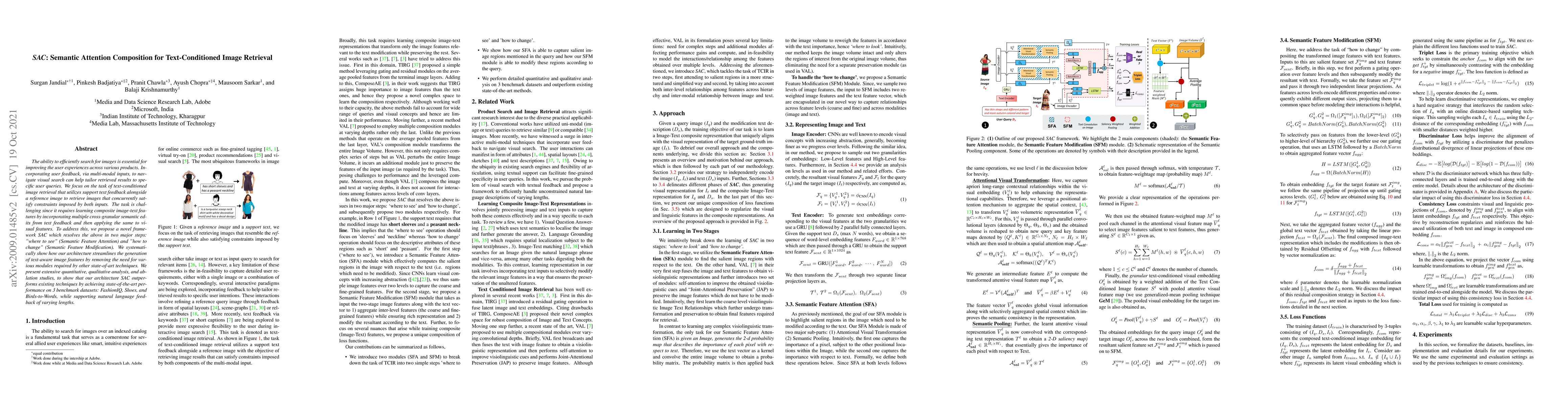 The ability to efficiently search for images is essential for improving the user experiences across various products. Incorporating user feedback, via multi-modal inputs, to navigate visual search can help tailor retrieved results to specific user queries. We focus on the task of text-conditioned image retrieval that utilizes support text feedback alongside a reference image to retrieve images that concurrently satisfy constraints imposed by both inputs. The task is challenging since it requires learning composite image-text features by incorporating multiple cross-granular semantic edits from text feedback and then applying the same to visual features. To address this, we propose a novel framework SAC which resolves the above in two major steps: "where to see" (Semantic Feature Attention) and "how to change" (Semantic Feature Modification). We systematically show how our architecture streamlines the generation of text-aware image features by removing the need for various modules required by other state-of-art techniques. We present extensive quantitative, qualitative analysis, and ablation studies, to show that our architecture SAC outperforms existing techniques by achieving state-of-the-art performance on 3 benchmark datasets: FashionIQ, Shoes, and Birds-to-Words, while supporting natural language feedback of varying lengths.