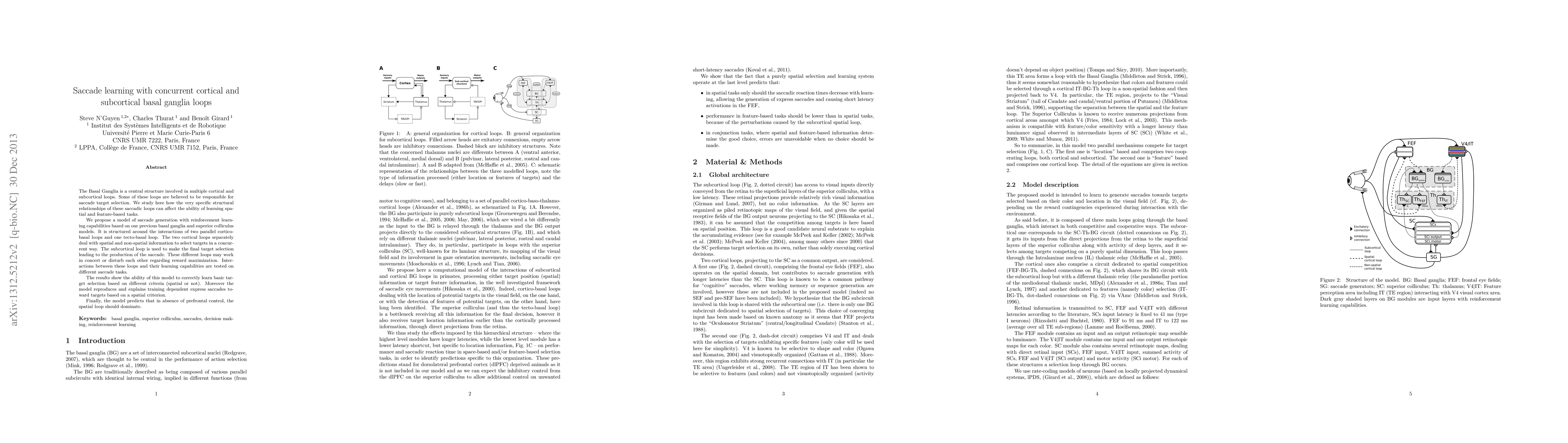 This paper proposes a model of saccade generation incorporating parallel cortical and subcortical basal ganglia loops, demonstrating its ability to learn spatial and feature-based target selection tasks. The model shows successful learning and explains the emergence of express saccades based on spatial criteria, predicting dominance of the spatial loop without prefrontal control.