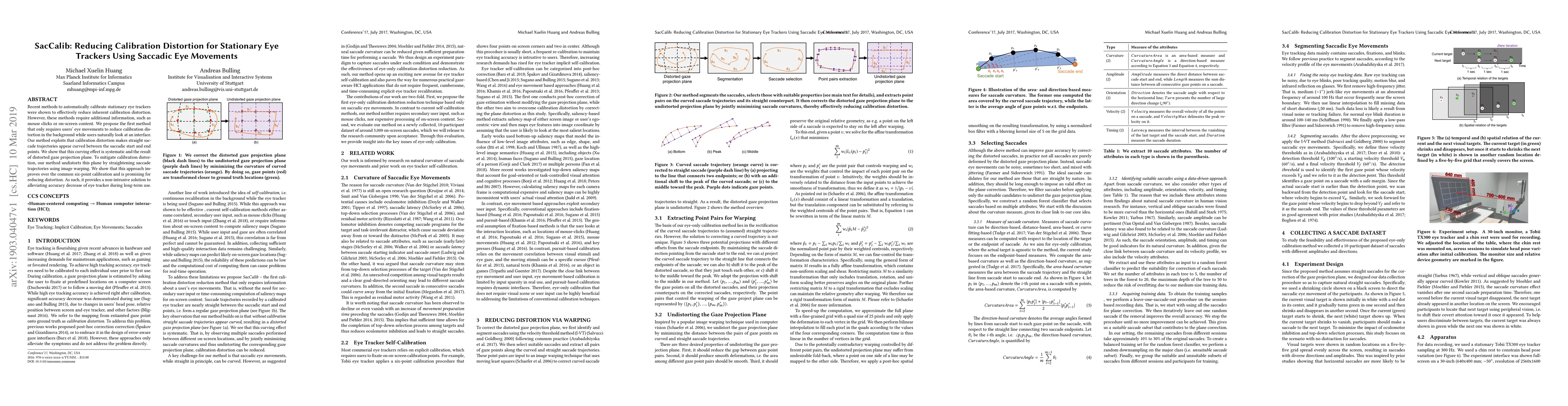 SacCalib reduces calibration distortion in stationary eye trackers by leveraging users' natural saccadic eye movements, without requiring additional input like mouse clicks or on-screen content. This method corrects the distorted gaze projection plane by straightening saccade trajectories, outperforming traditional six-point calibration and offering a non-intrusive solution for long-term eye tracker accuracy.
