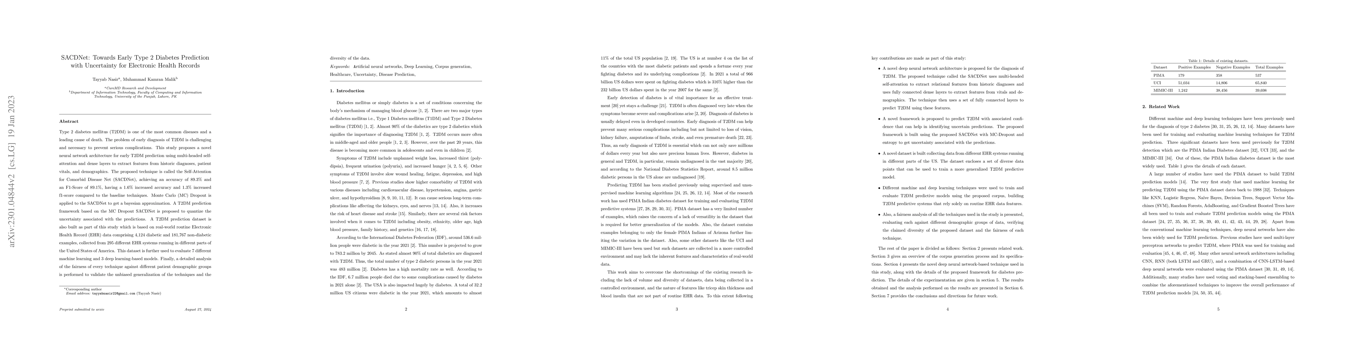This paper introduces SACDNet, a novel neural network architecture for early Type 2 Diabetes Mellitus (T2DM) prediction using self-attention and dense layers, achieving improved accuracy and F1-score. It also employs Monte Carlo Dropout for uncertainty quantification and builds a new dataset from real-world EHR data for model evaluation and fairness analysis.