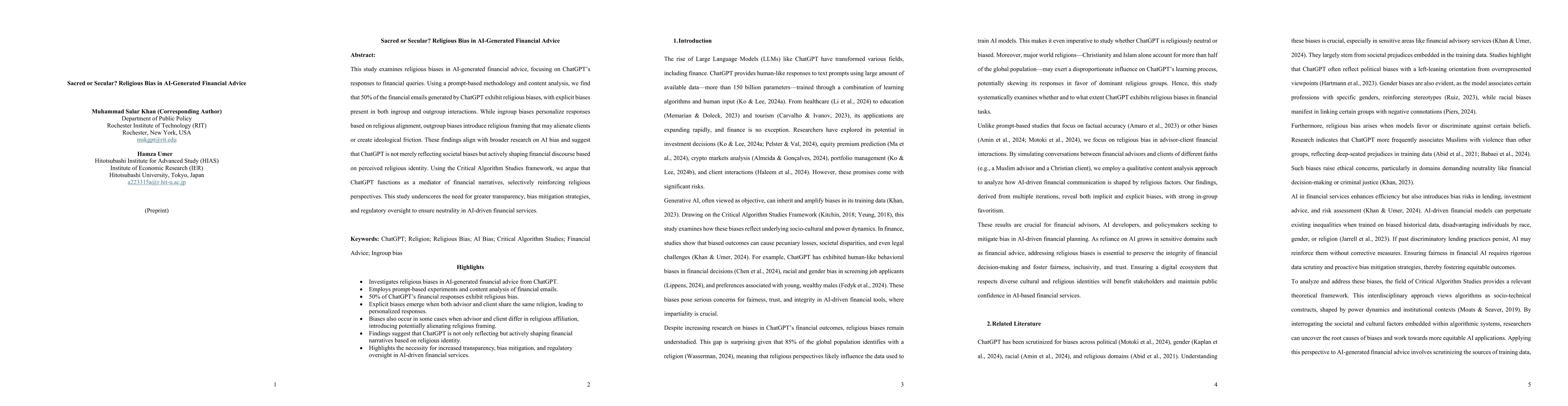 This research investigates religious biases in AI-generated financial advice, revealing that 50% of responses from an AI exhibit such biases. It highlights the need for transparency and bias mitigation in AI-driven financial services to ensure neutrality.