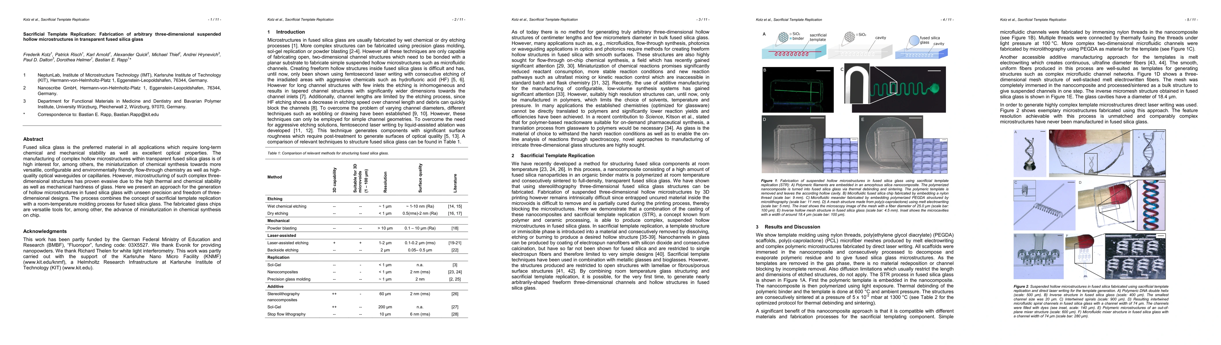 This paper introduces a novel method for creating precise, three-dimensional hollow microstructures in transparent fused silica glass using sacrificial template replication and room-temperature molding. This technique enables the fabrication of complex designs, advancing applications in miniaturized chemical synthesis and optical waveguides.