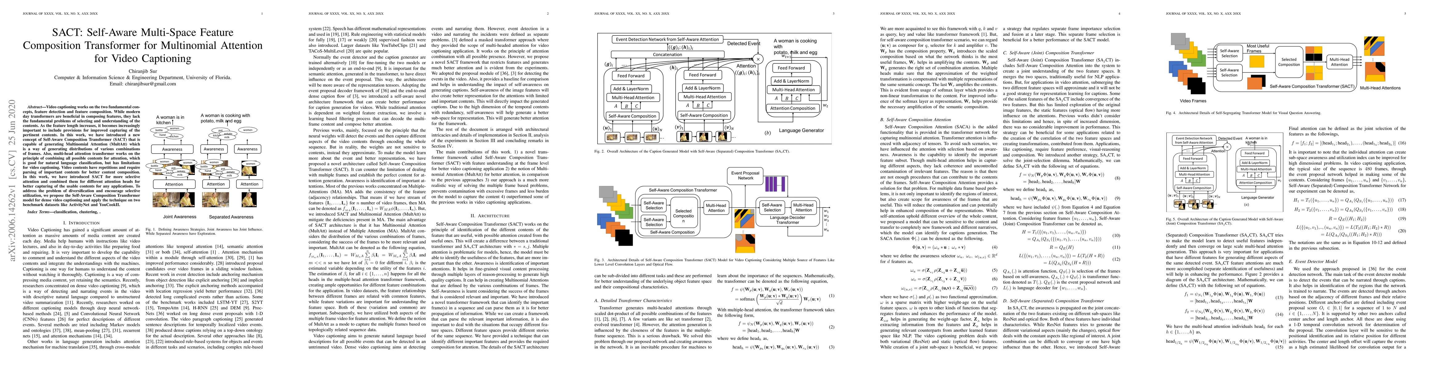 The paper introduces the Self-Aware Composition Transformer (SACT) for video captioning, which employs Multinomial Attention to selectively parse and combine important video frames, enhancing feature composition over traditional transformers. The proposed model is tested on ActivityNet and YouCookII datasets to demonstrate its effectiveness in dense video captioning.