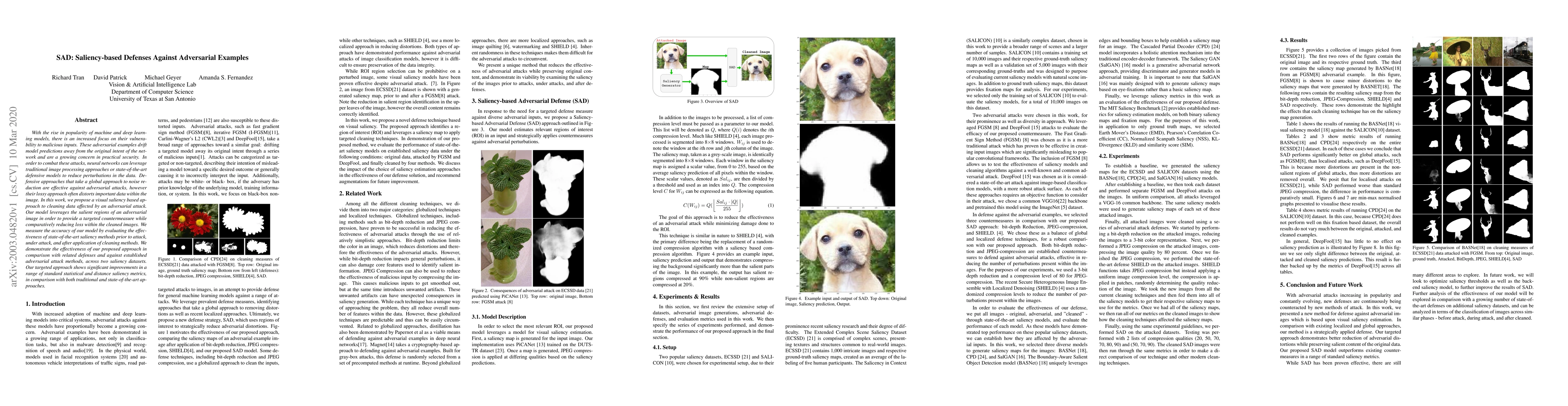 This paper proposes a saliency-based defense against adversarial examples that leverages salient regions to clean perturbed data while minimizing distortion. The approach demonstrates significant improvements in accuracy and saliency metrics compared to traditional and state-of-the-art defenses across multiple datasets.