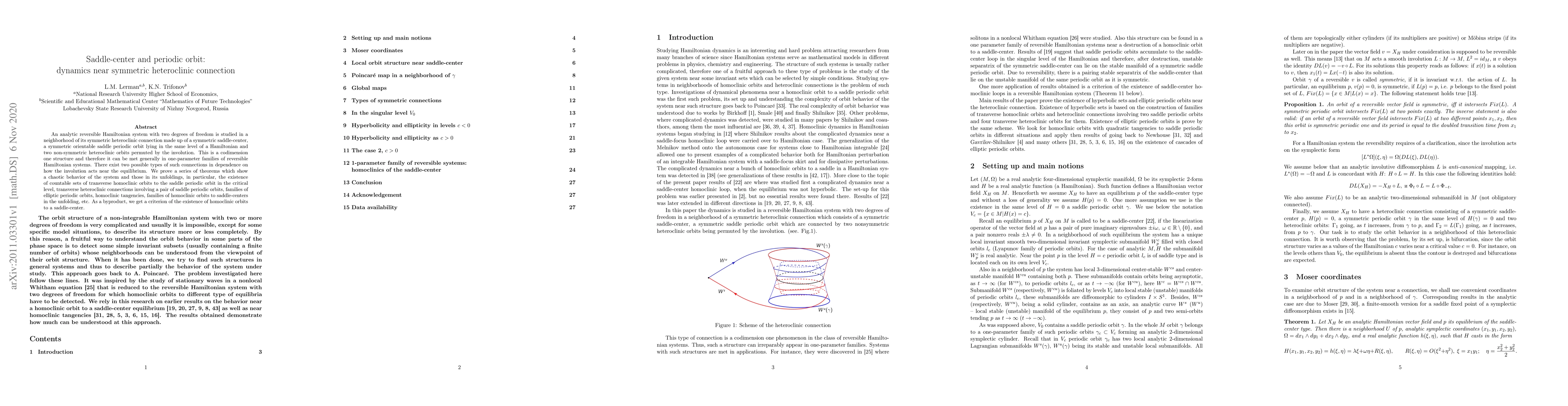 This paper studies the dynamics of a reversible Hamiltonian system near a symmetric heteroclinic connection, revealing chaotic behavior and the existence of various transverse and homoclinic orbits, including elliptic periodic orbits and homoclinic tangencies. The analysis also provides a criterion for the existence of homoclinic orbits to a saddle-center.