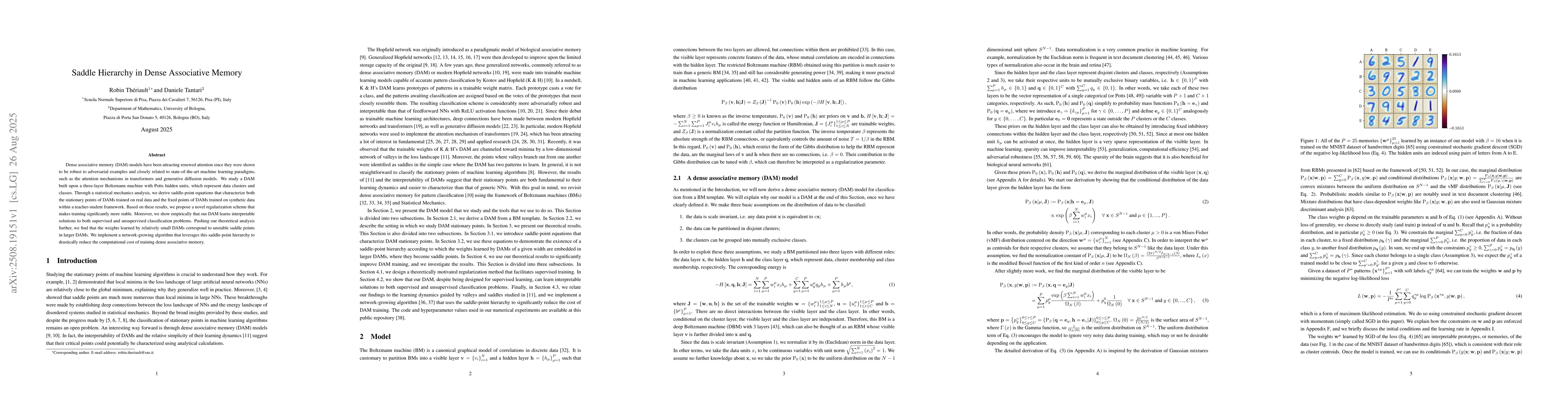 Dense associative memory (DAM) models have been attracting renewed attention since they were shown to be robust to adversarial examples and closely related to state-of-the-art machine learning paradigms, such as the attention mechanisms in transformers and generative diffusion models. We study a DAM built upon a three-layer Boltzmann machine with Potts hidden units, which represent data clusters and classes. Through a statistical mechanics analysis, we derive saddle-point equations that characterize both the stationary points of DAMs trained on real data and the fixed points of DAMs trained on synthetic data within a teacher-student framework. Based on these results, we propose a novel regularization scheme that makes training significantly more stable. Moreover, we show empirically that our DAM learns interpretable solutions to both supervised and unsupervised classification problems. Pushing our theoretical analysis further, we find that the weights learned by relatively small DAMs correspond to unstable saddle points in larger DAMs. We implement a network-growing algorithm that leverages this saddle-point hierarchy to drastically reduce the computational cost of training dense associative memory.