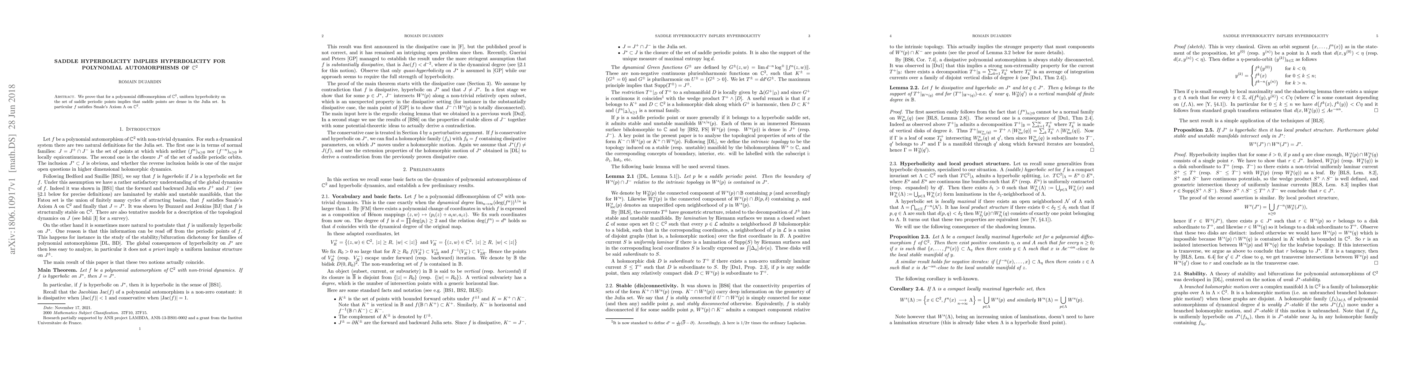 We prove that for a polynomial diffeomorphism of C^2, uniform hyperbolicity on the set of saddle periodic points implies that saddle points are dense in the Julia set. In particular f satisfies Smale's Axiom A on C^2 .